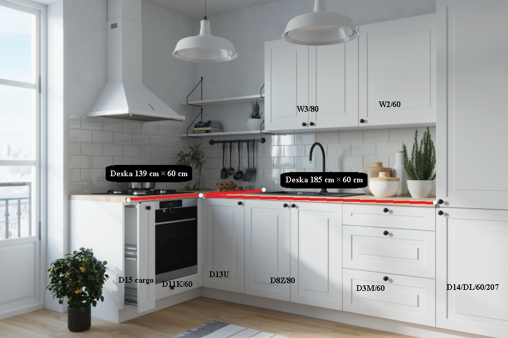 Skříňky se dodávají v demontu a můžete je seřadit libovolně, nemusíte se držet pořadí na fotografii. Pokud vám složení sestavy nevyhovuje, můžete si poskládat vlastní kuchyni na míru z horních a dolních skříněk.