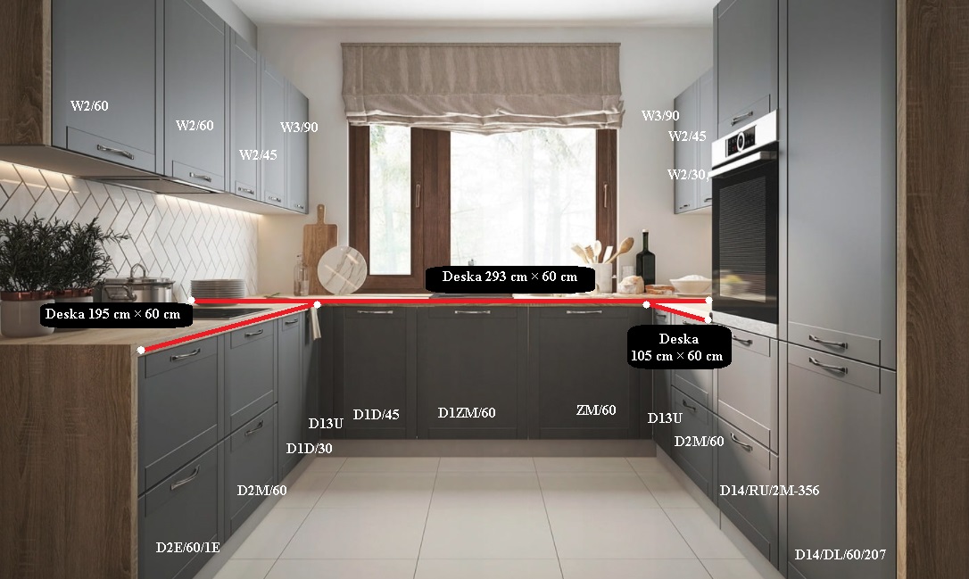 Skříňky se dodávají v demontu a můžete je seřadit libovolně, nemusíte se držet pořadí na fotografii. Pokud vám složení sestavy nevyhovuje, můžete si poskládat vlastní kuchyni na míru z horních a dolních skříněk.