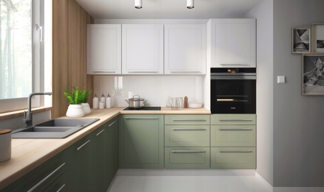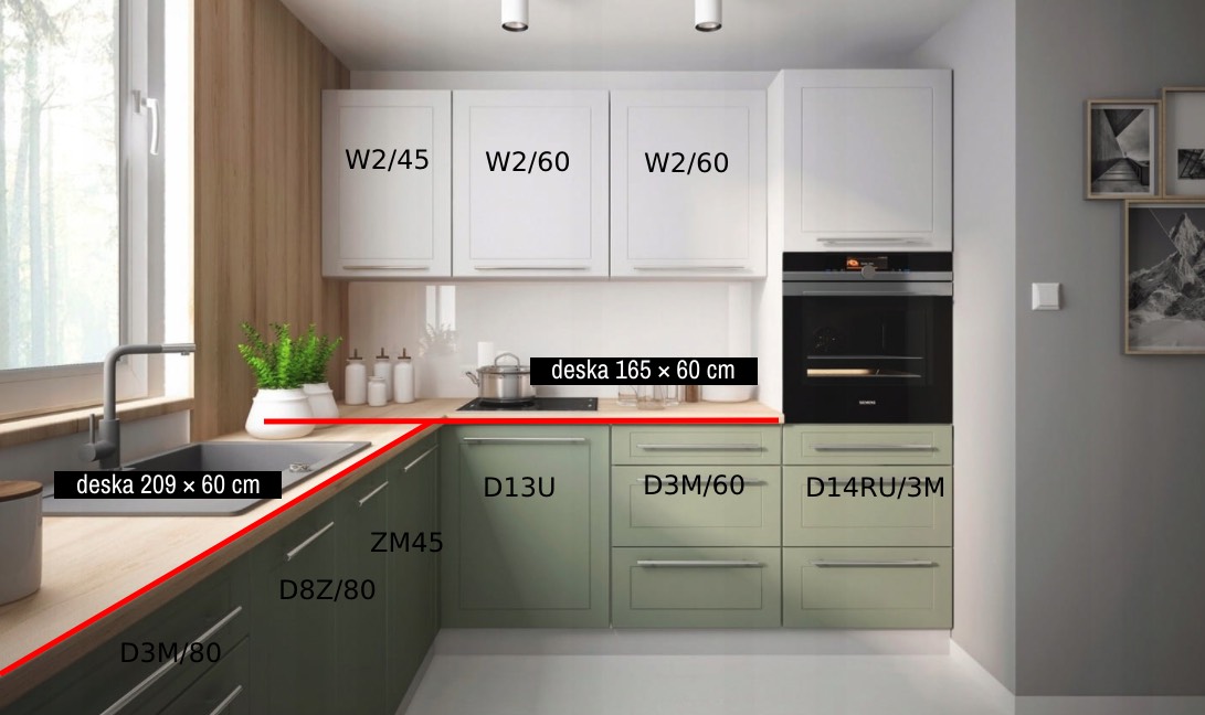 Skříňky se dodávají v demontu a můžete je seřadit libovolně, nemusíte se držet pořadí na fotografii. Pokud vám složení sestavy nevyhovuje, můžete si poskládat vlastní kuchyni na míru z horních a dolních skříněk.