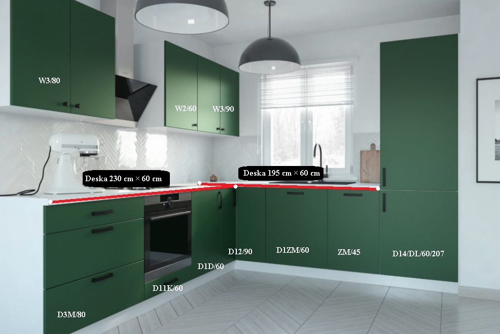 Skříňky se dodávají v demontu a můžete je seřadit libovolně, nemusíte se držet pořadí na fotografii. Pokud vám složení sestavy nevyhovuje, můžete si poskládat vlastní kuchyni na míru z horních a dolních skříněk.