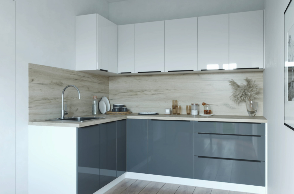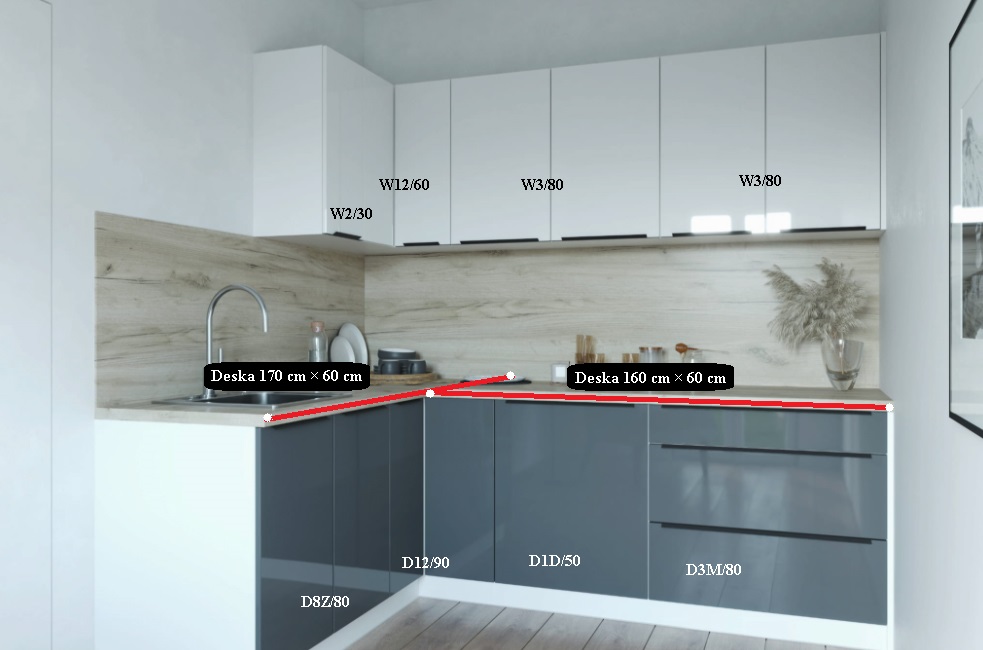 Skříňky se dodávají v demontu a můžete je seřadit libovolně, nemusíte se držet pořadí na fotografii. Pokud vám složení sestavy nevyhovuje, můžete si poskládat vlastní kuchyni na míru z horních a dolních skříněk.