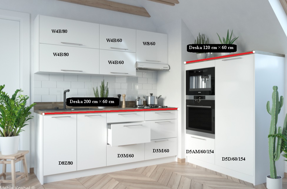 Skříňky se dodávají v demontu a můžete je seřadit libovolně, nemusíte se držet pořadí na fotografii. Pokud vám složení sestavy nevyhovuje, můžete si poskládat vlastní kuchyni na míru z horních a dolních skříněk.