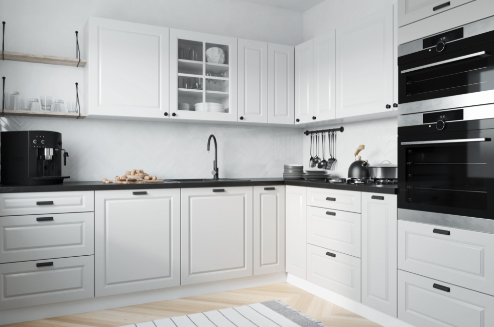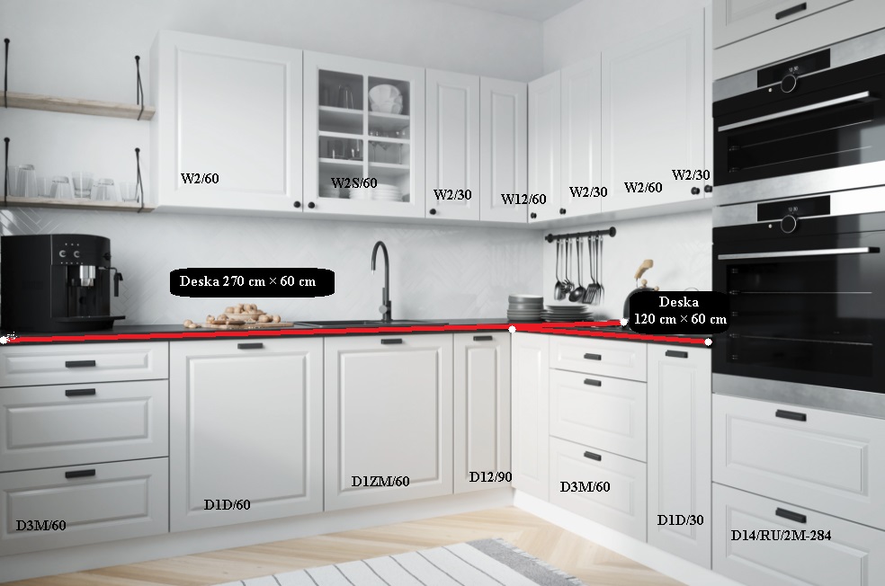 Skříňky se dodávají v demontu a můžete je seřadit libovolně, nemusíte se držet pořadí na fotografii. Pokud vám složení sestavy nevyhovuje, můžete si poskládat vlastní kuchyni na míru z horních a dolních skříněk.