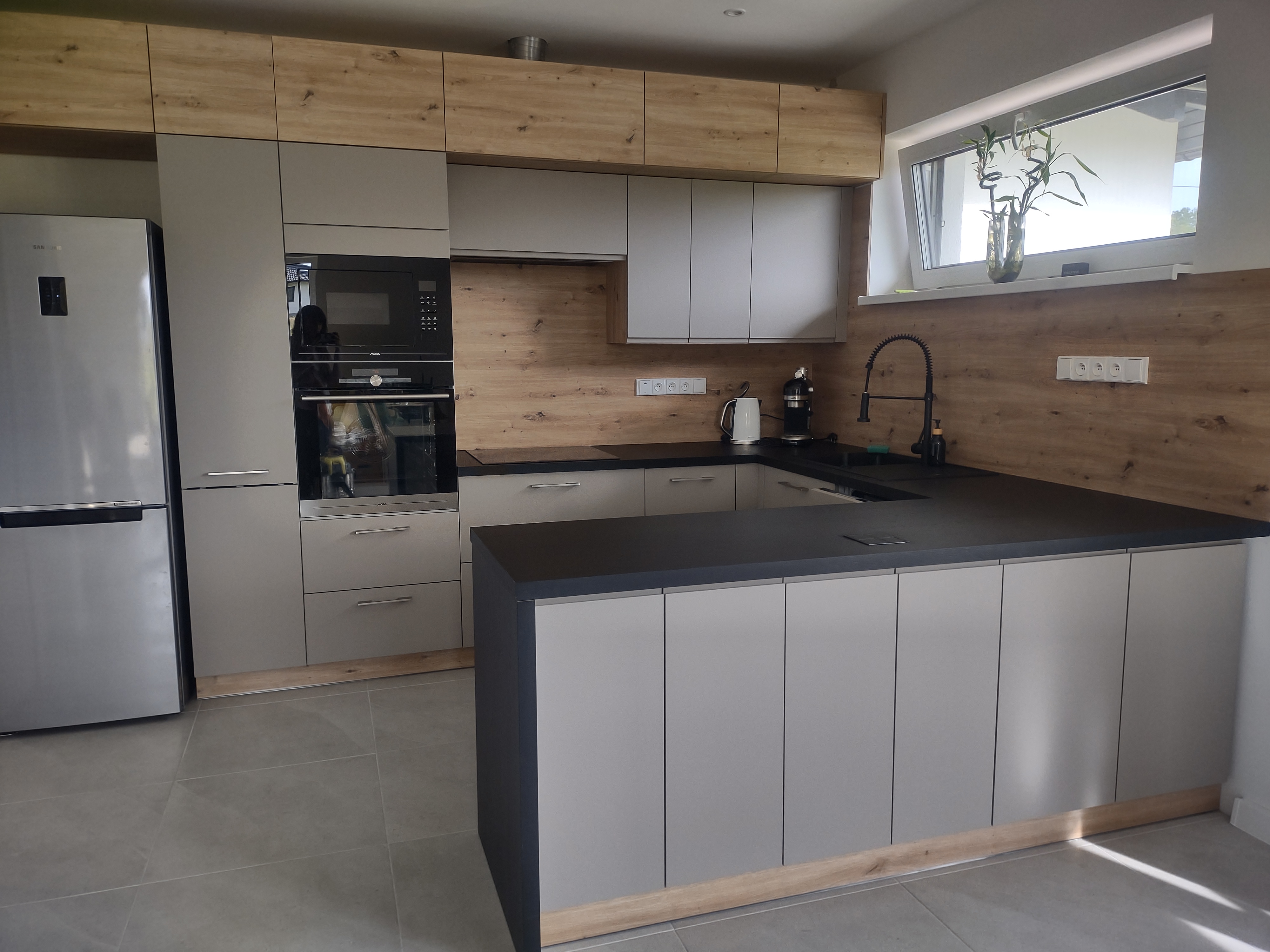 Prémiové pracovní desky nemají žádné zaoblení (nos). Jsou zakončeny PP hranou 1,2 mm. Na první pohled působí velmi moderně.