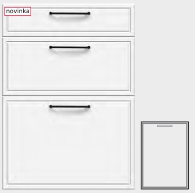 Korpusy jsou vyrobeny z kvalitní LTD desky o síle 16 mm. Police s nosností 15 Kg jsou důmyslně zabezpečeny proti samovolnému vysunutí. Záda jsou ze sololitu. Úchytky a kování jsou součástí balení. MDF dvířka 16 mm v různých barvách, s volitelným typem frézování a tlumeným dovíráním zdarma (kromě rohových skříněk).