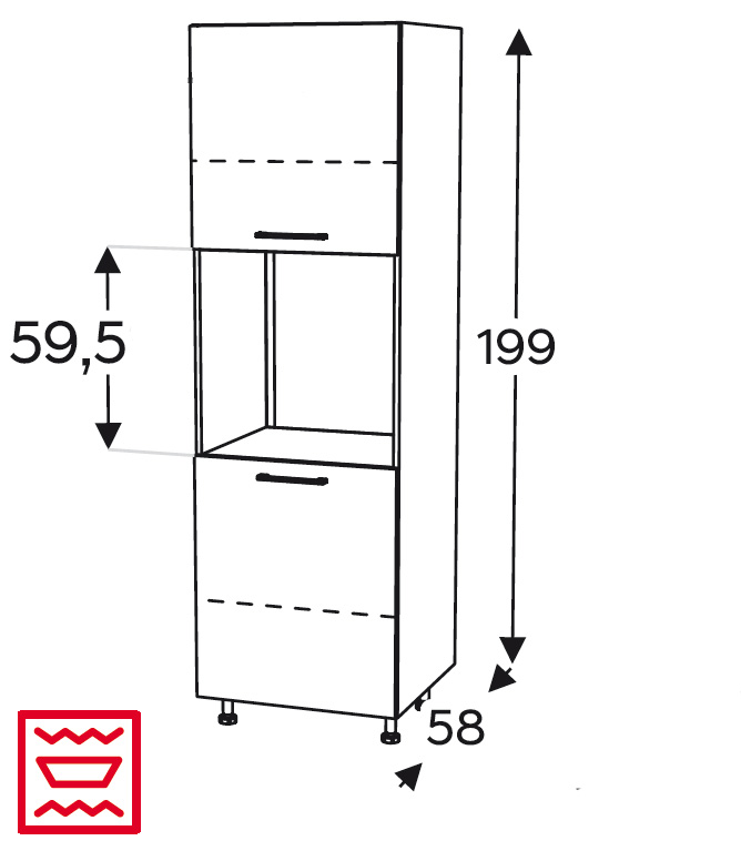 Výška nezahrnuje nožky (10 nebo 15 cm). Vnitřní rozměr trouby: 59,5 cm