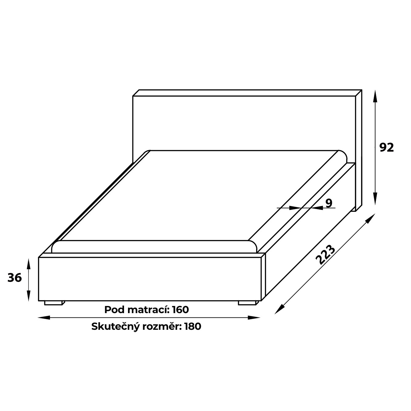 Výška nezahrnuje matraci. Výška čela: 92 cm. Ložná plocha: 160×200 cm