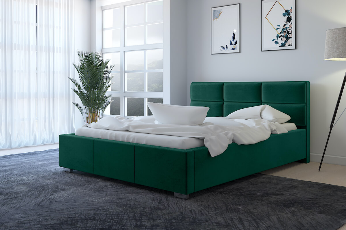 Postel Nelo představuje moderní a elegantní kus nábytku. Zaujme na první pohled vysokým čelem rozděleným na 6 polí, které za příplatek lze ještě zvýšit. Je vyrobena pouze z kvalitních materiálů, nožky jsou z masivu (žádné levné plasty tedy nečekejte). Kovový rošt, který obsahuje 34 lamel (případně můžete zvolit variantu s 48 lamelami), se postará o maximální pohodlí a také o pořádnou nosnost (ta činí celých 120 kg na každou stranu dvoulůžka). Pod roštem se skrývá obrovský úložný prostor, který se otevírá automatickými plynovými písty. Dno úložného prostoru je vyrobeno z odolné HDF desky (nikoliv ze sololitu, nehrozí tedy prohnutí pod náporem věcí), kterou lze bez potíží při úklidu vyjmout a následně ji zase vrátit bez nutnosti postel demontovat.