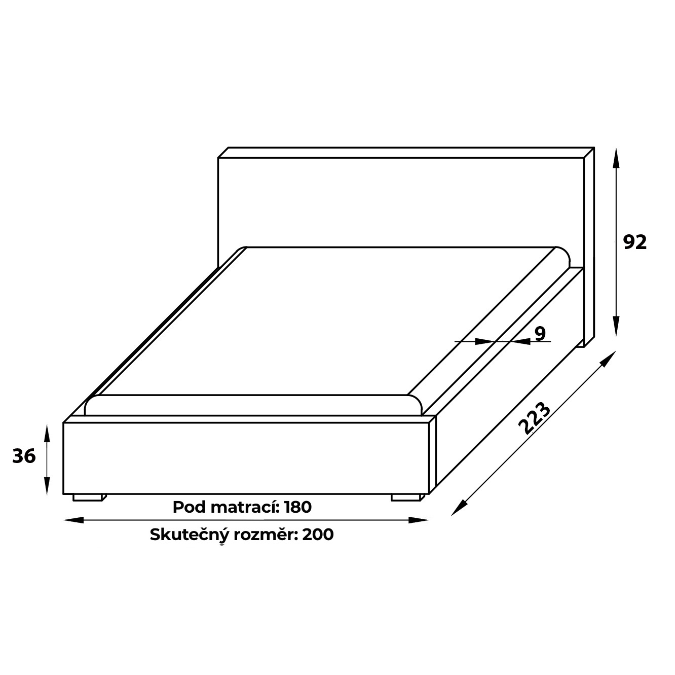 Výška nezahrnuje matraci. Výška čela: 92 cm. Ložná plocha: 180×200 cm