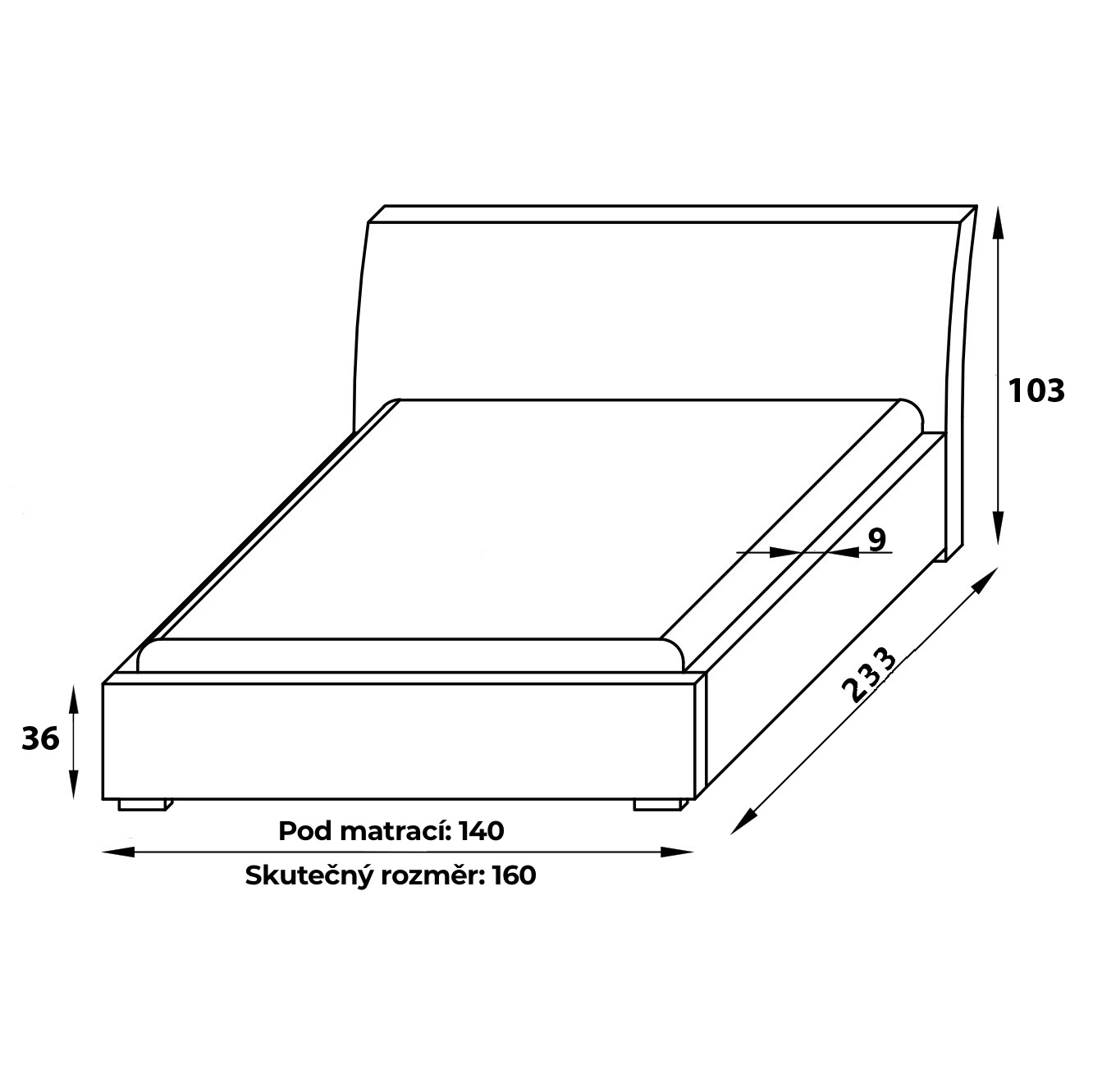 Výška nezahrnuje matraci. Výška čela: 103 cm. Ložná plocha: 140×200 cm