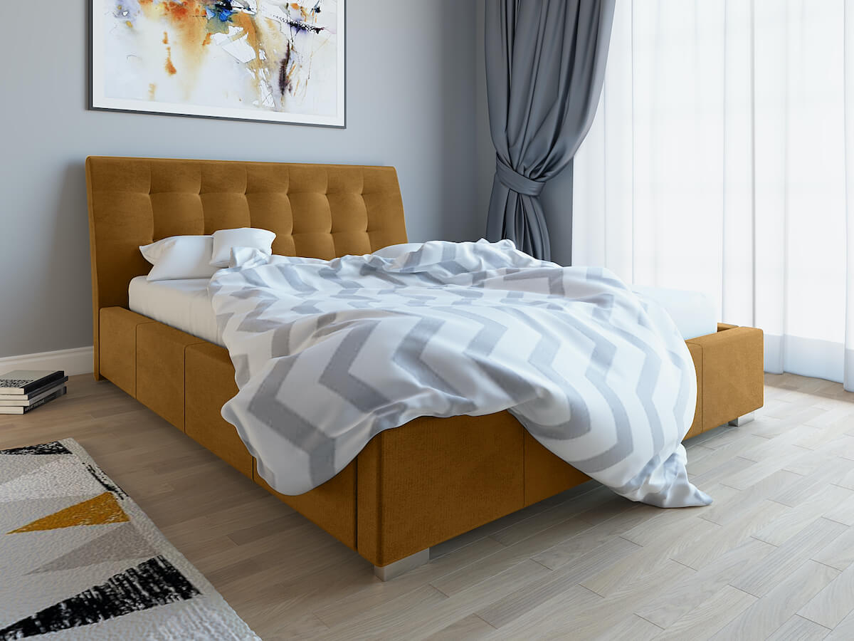 Čalouněné postele Hermes nepřehlédnete díky jejich zaoblenému a bohatě polstrovanému čelu. Je vyrobena pouze z kvalitních materiálů, nožky jsou z masivu (žádné levné plasty tedy nečekejte). Kovový rošt, který obsahuje 34 lamel (případně můžete zvolit variantu s 48 lamelami), se postará o maximální pohodlí a také o pořádnou nosnost (ta činí celých 120 kg na každou stranu dvoulůžka). Pod roštem se skrývá obrovský úložný prostor, který se otevírá automatickými plynovými písty. Dno úložného prostoru je vyrobeno z vyjímatelné a odolné HDF desky (nikoliv ze sololitu, nehrozí tedy prohnutí pod náporem věcí).
