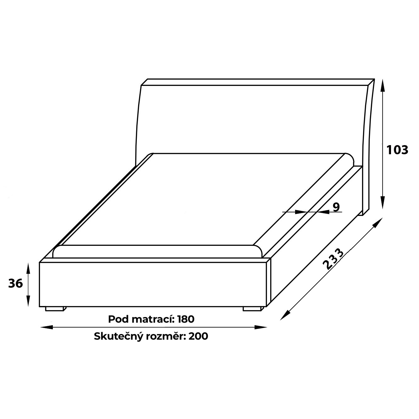 Výška nezahrnuje matraci. Výška čela: 103 cm. Ložná plocha: 180×200 cm