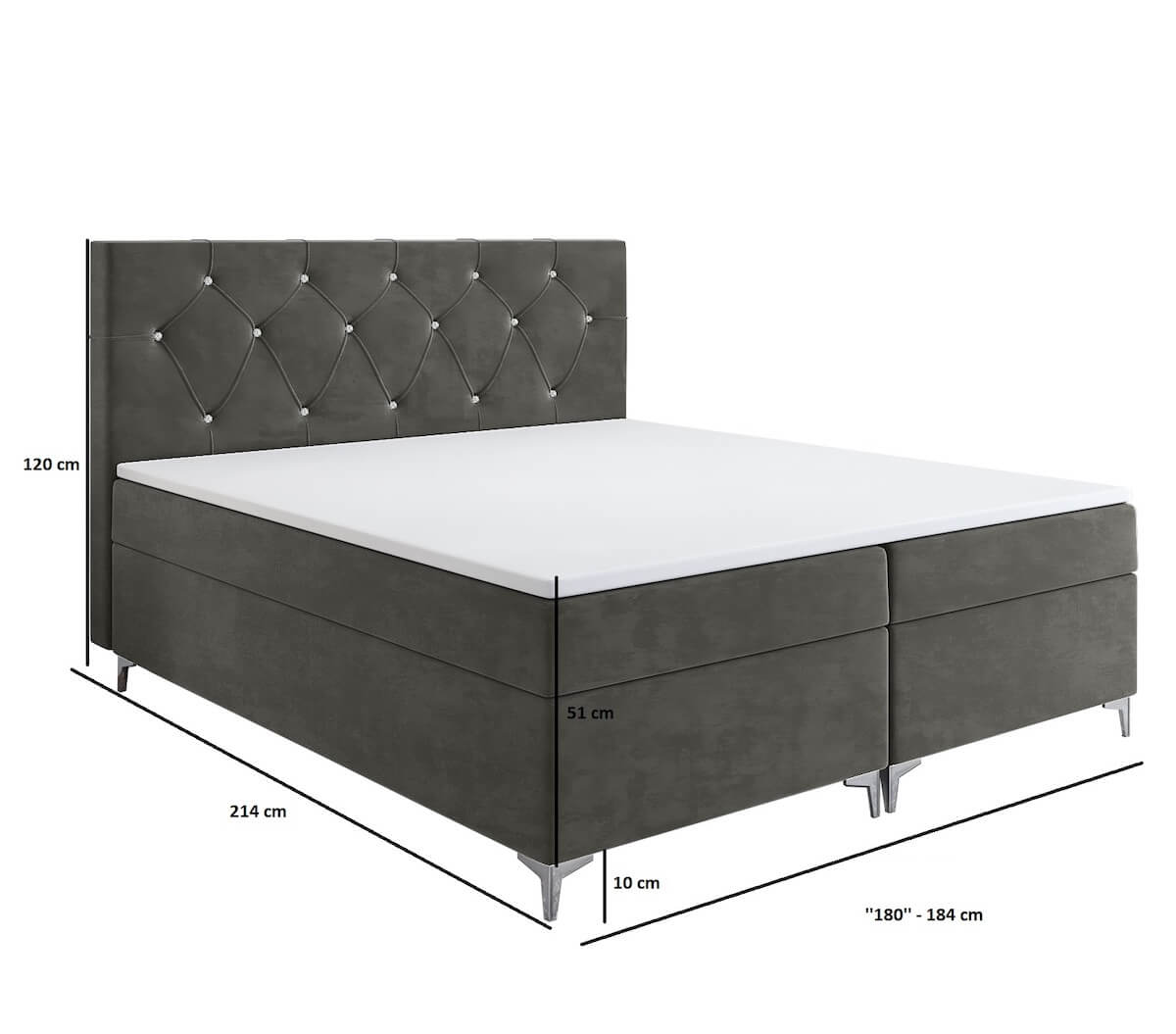 Výška vč. matrace a 12cm nožek. Výška čela: 120 cm. Ložná plocha: 180×200 cm