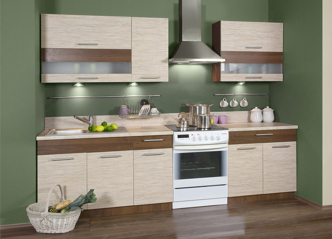 Skříňky se dodávají v demontu a můžete je seřadit libovolně, nemusíte se držet pořadí na fotografii. Pokud vám složení sestavy nevyhovuje, můžete si poskládat vlastní kuchyni na míru z horních a dolních skříněk.