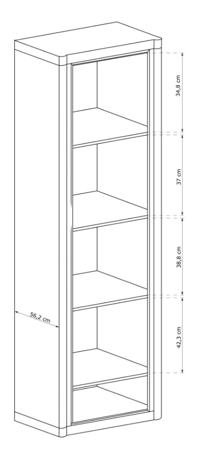 Skříň se třemi policemi. Dvířka se otevírají doleva.