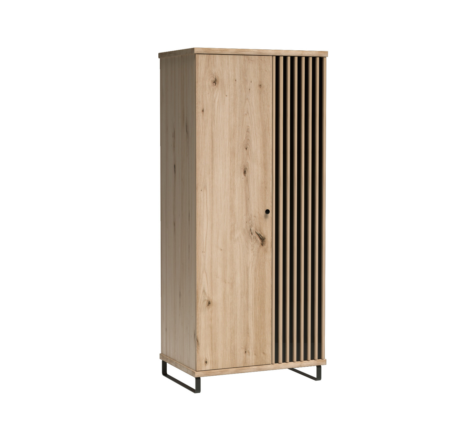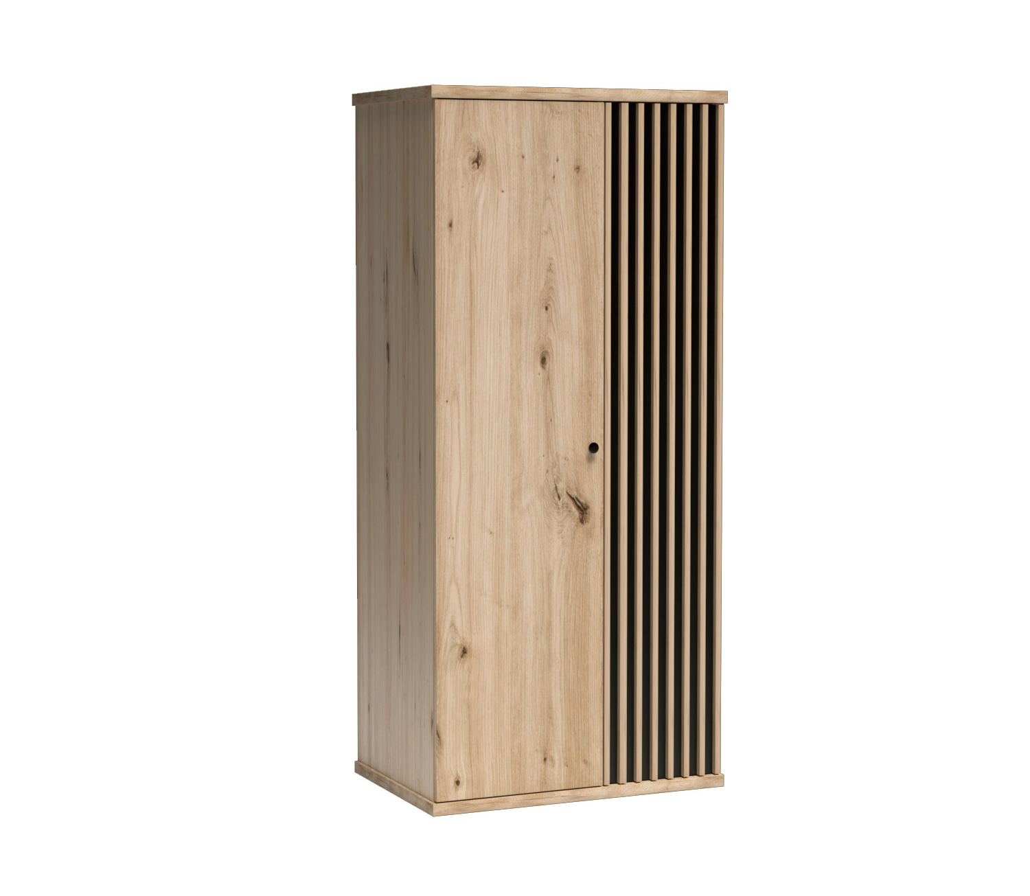 Výrazným prvkem nábytku Cali v dekoru dub artisan jsou ozdobné lamely na černém matném pozadí. Jedna z lamel je upravená a slouží jako stylová úchytka, která nijak nenarušuje celkový design. Moderní interiér v přírodních barvách vytvoříte jednoduše použitím dekorativních panelů. Vybírejte pro váš domov předsíňovou stěnu, konferenční stolek, komody a další typy nábytku.