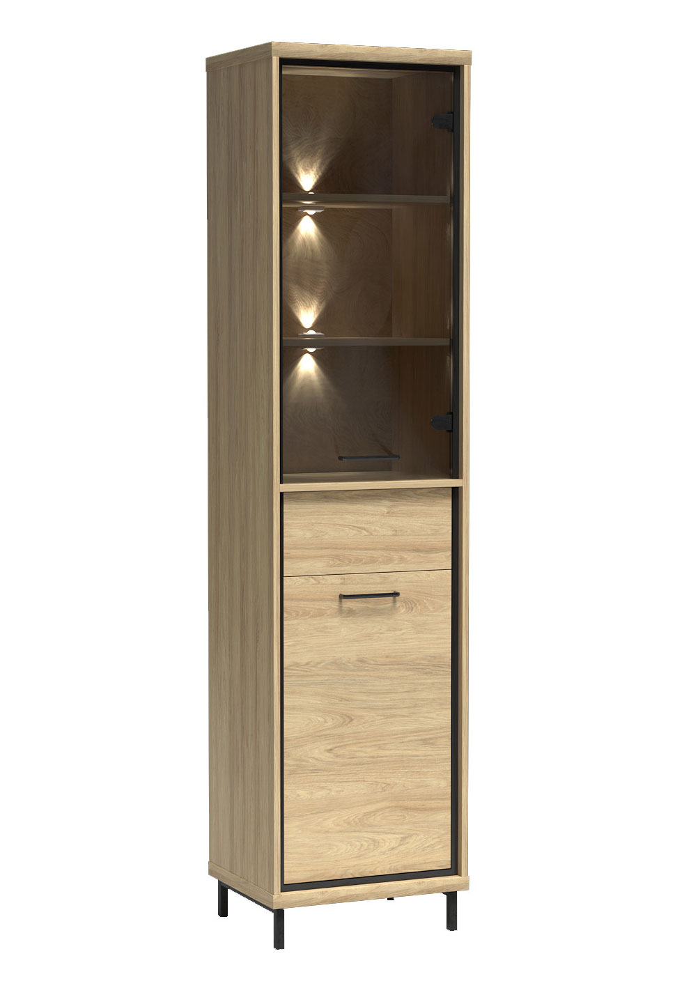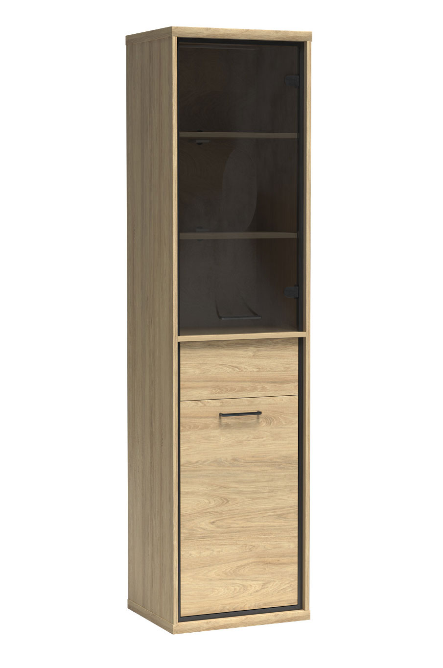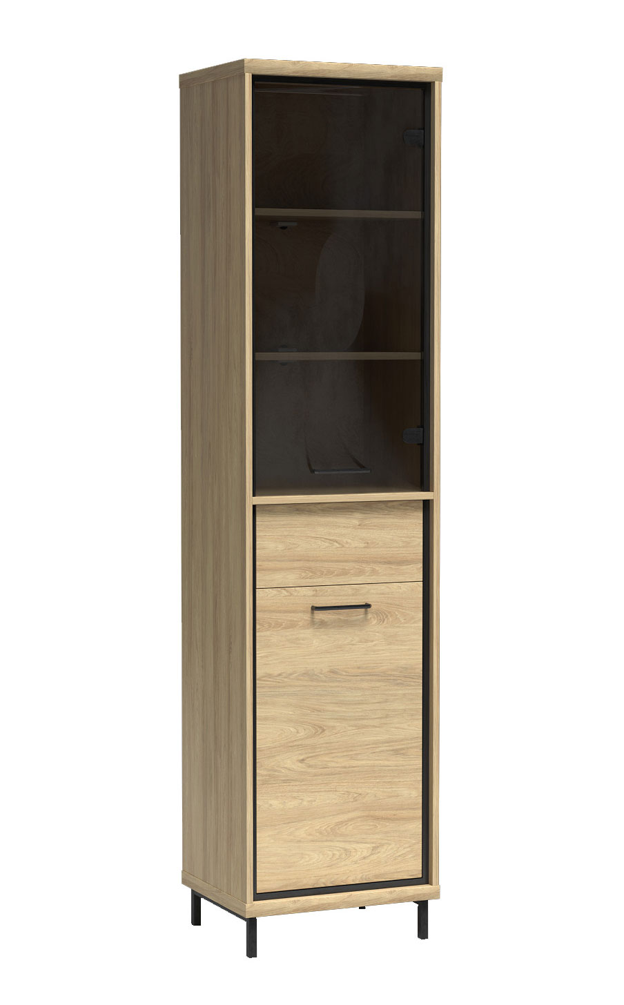 Řada Mediolan je vyrobená z lamino desek o tloušťce 16 a 32 mm, má ABS hrany, dřevěné části, záda z HDF a kovové úchytky s roztečí 128 mm. Dvířka jsou opatřená mechanismem pro tiché dovírání. Zásuvky jsou bez úchytek, otevírají se zmáčknutím (push to open) do plného výsuvu. Vitríny jsou vyplněné tvrzeným sklem. Nábytek můžete instalovat na černé nožky o výšce 10 cm.