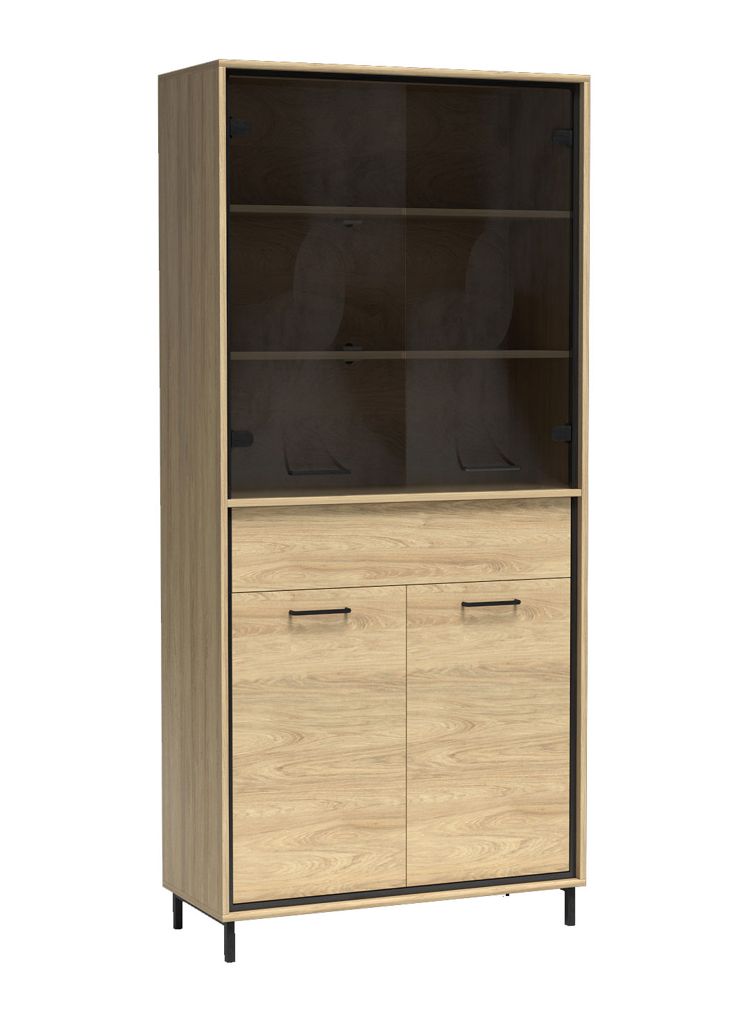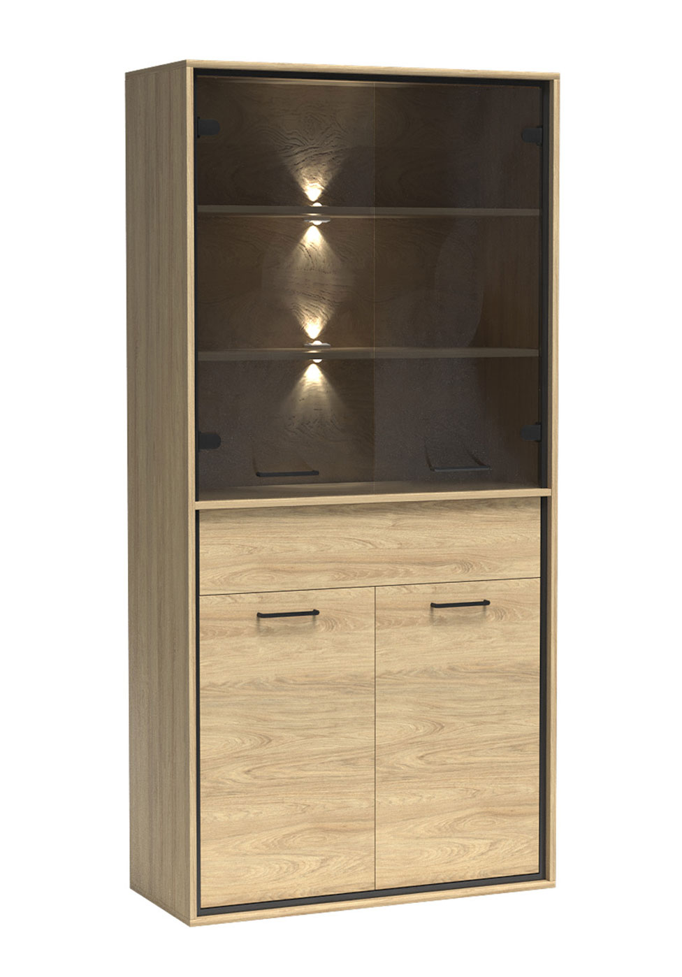 Řada Mediolan je vyrobená z lamino desek o tloušťce 16 a 32 mm, má ABS hrany, dřevěné části, záda z HDF a kovové úchytky s roztečí 128 mm. Dvířka jsou opatřená mechanismem pro tiché dovírání. Zásuvky jsou bez úchytek, otevírají se zmáčknutím (push to open) do plného výsuvu. Vitríny jsou vyplněné tvrzeným sklem. Nábytek můžete instalovat na černé nožky o výšce 10 cm.