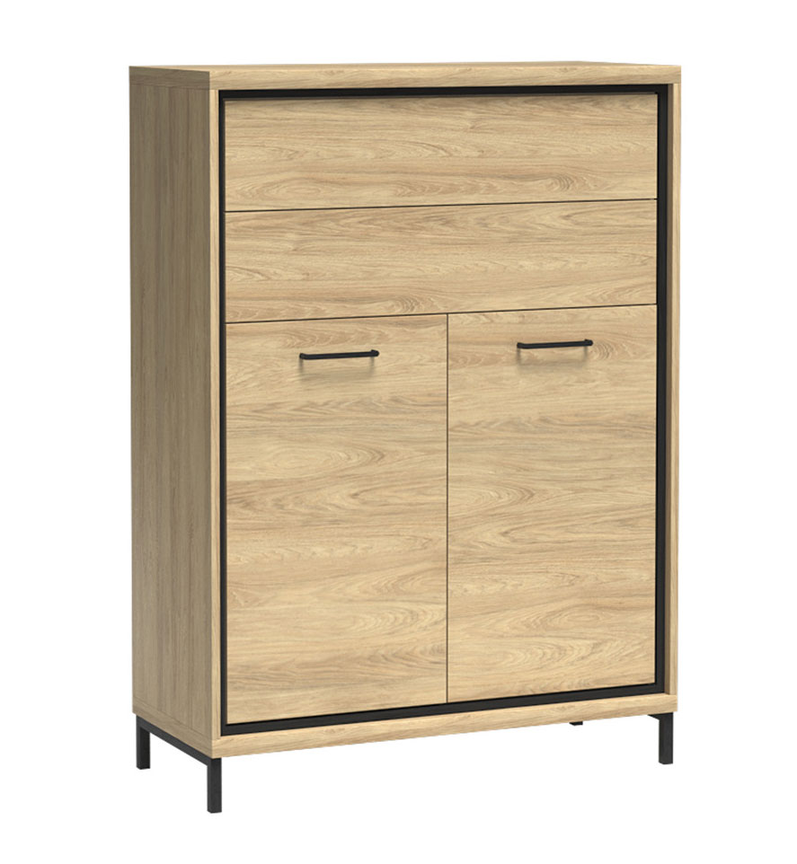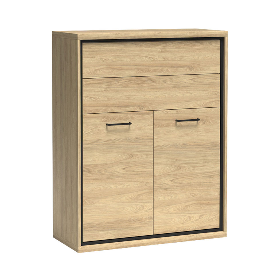 Řada Mediolan je vyrobená z lamino desek o tloušťce 16 a 32 mm, má ABS hrany, dřevěné části, záda z HDF a kovové úchytky s roztečí 128 mm. Dvířka jsou opatřená mechanismem pro tiché dovírání. Zásuvky jsou bez úchytek, otevírají se zmáčknutím (push to open) do plného výsuvu. Vitríny jsou vyplněné tvrzeným sklem. Nábytek můžete instalovat na černé nožky o výšce 10 cm.