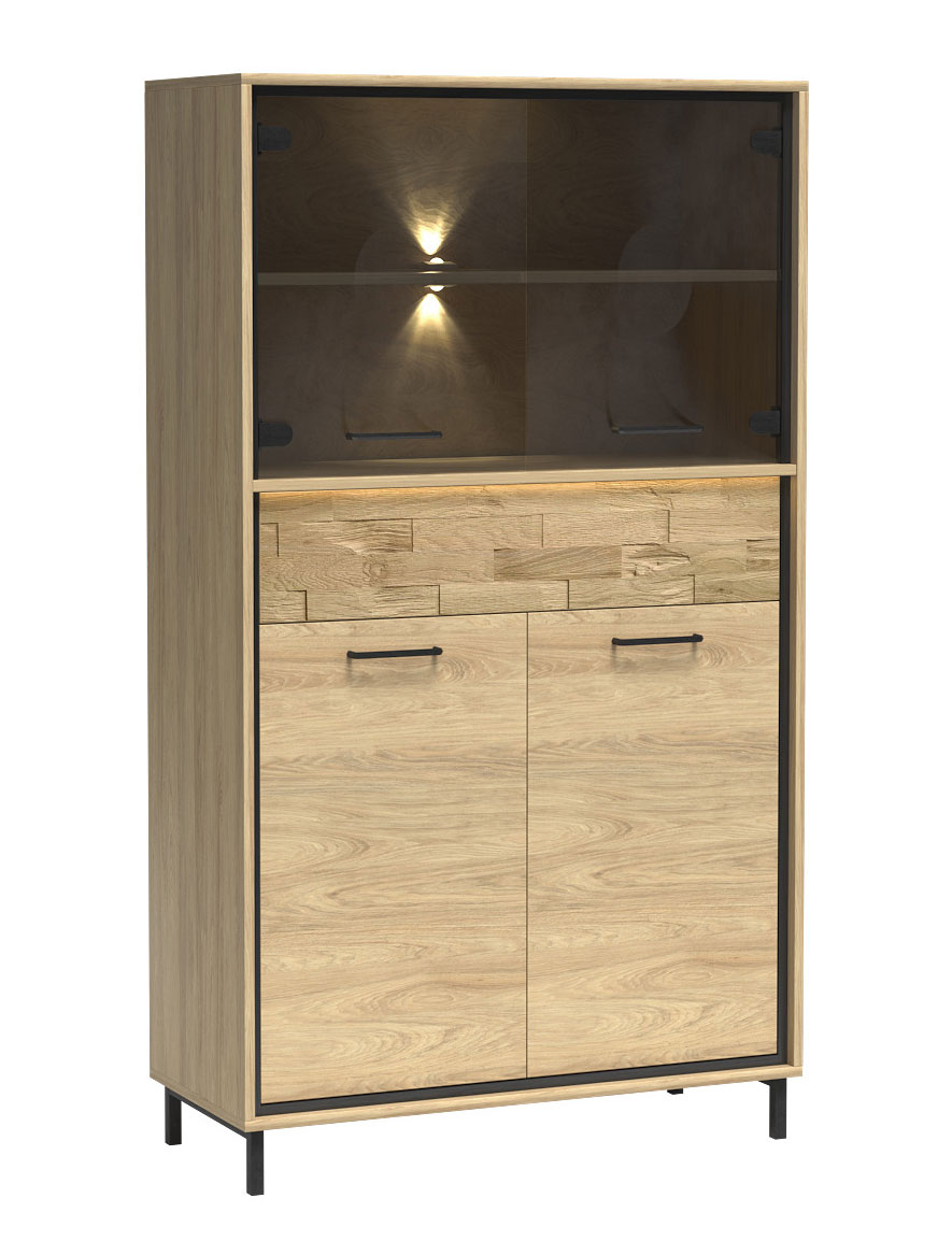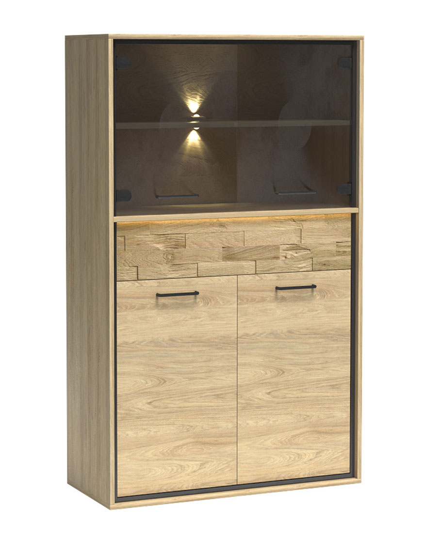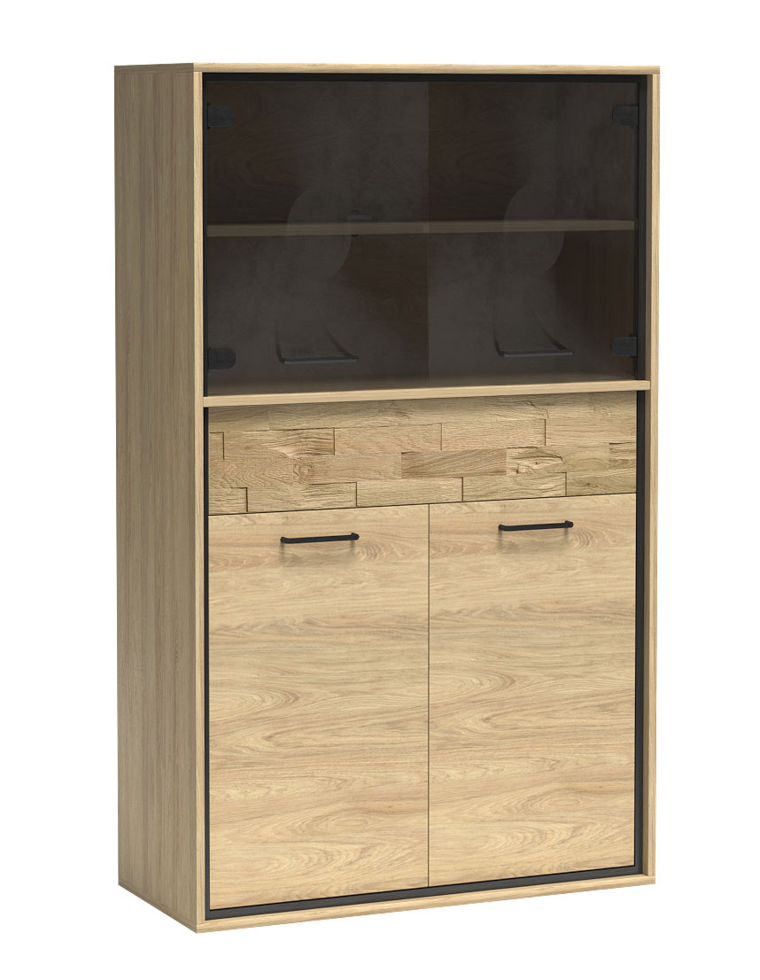 Řada Mediolan je vyrobená z lamino desek o tloušťce 16 a 32 mm, má ABS hrany, dřevěné části, záda z HDF a kovové úchytky s roztečí 128 mm. Dvířka jsou opatřená mechanismem pro tiché dovírání. Zásuvky jsou bez úchytek, otevírají se zmáčknutím (push to open) do plného výsuvu. Vitríny jsou vyplněné tvrzeným sklem. Nábytek můžete instalovat na černé nožky o výšce 10 cm.