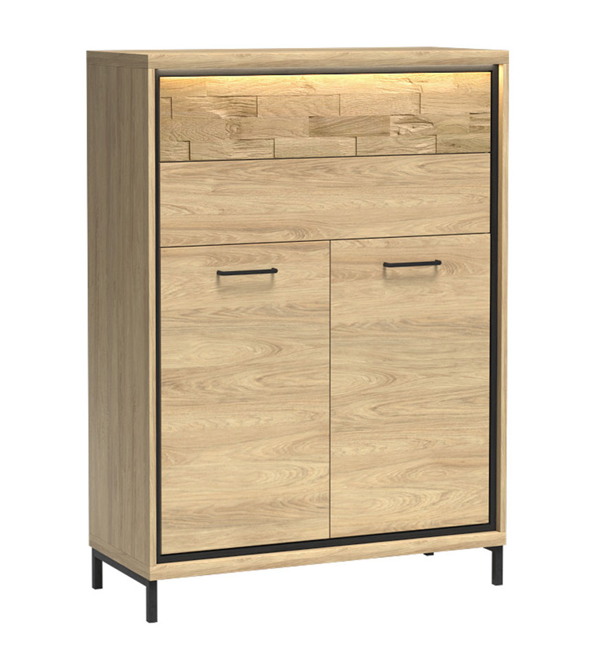 Teplé barvy s černými doplňky vykouzlí interiér v industriálním stylu. Hladká čela zásuvek můžete vyměnit za panel z dubového dřeva s ozdobným vzorem. Doplňkové LED osvětlení obohatí každý interiér. Vybírejte šatní skříně s posuvnými dveřmi, noční stolky i manželskou postel.