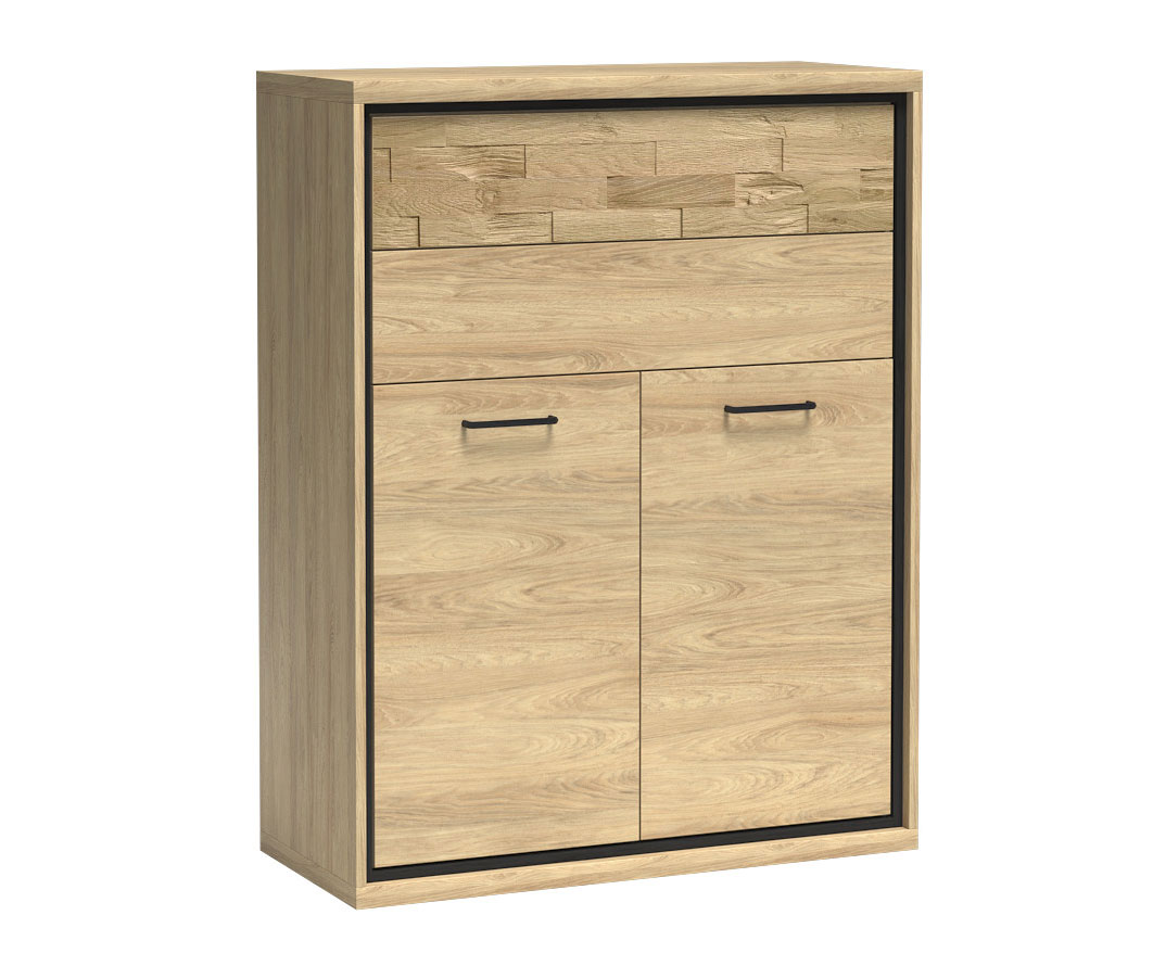 Řada Mediolan je vyrobená z lamino desek o tloušťce 16 a 32 mm, má ABS hrany, dřevěné části, záda z HDF a kovové úchytky s roztečí 128 mm. Dvířka jsou opatřená mechanismem pro tiché dovírání. Zásuvky jsou bez úchytek, otevírají se zmáčknutím (push to open) do plného výsuvu. Vitríny jsou vyplněné tvrzeným sklem. Nábytek můžete instalovat na černé nožky o výšce 10 cm.