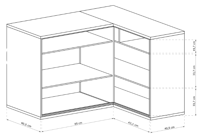 Řada Mediolan je vyrobená z lamino desek o tloušťce 16 a 32 mm, má ABS hrany, dřevěné části, záda z HDF a kovové úchytky s roztečí 128 mm. Dvířka jsou opatřená mechanismem pro tiché dovírání. Zásuvky jsou bez úchytek, otevírají se zmáčknutím (push to open) do plného výsuvu. Vitríny jsou vyplněné tvrzeným sklem. Nábytek můžete instalovat na černé nožky o výšce 10 cm.