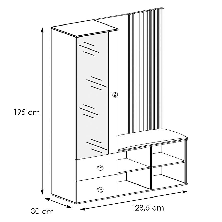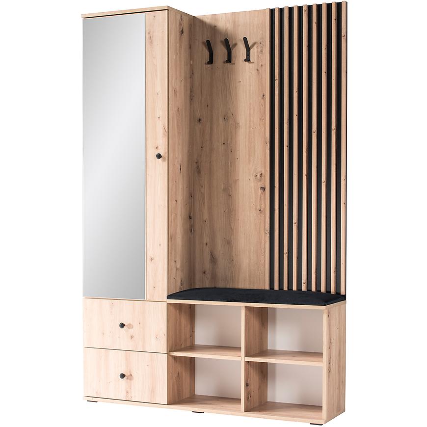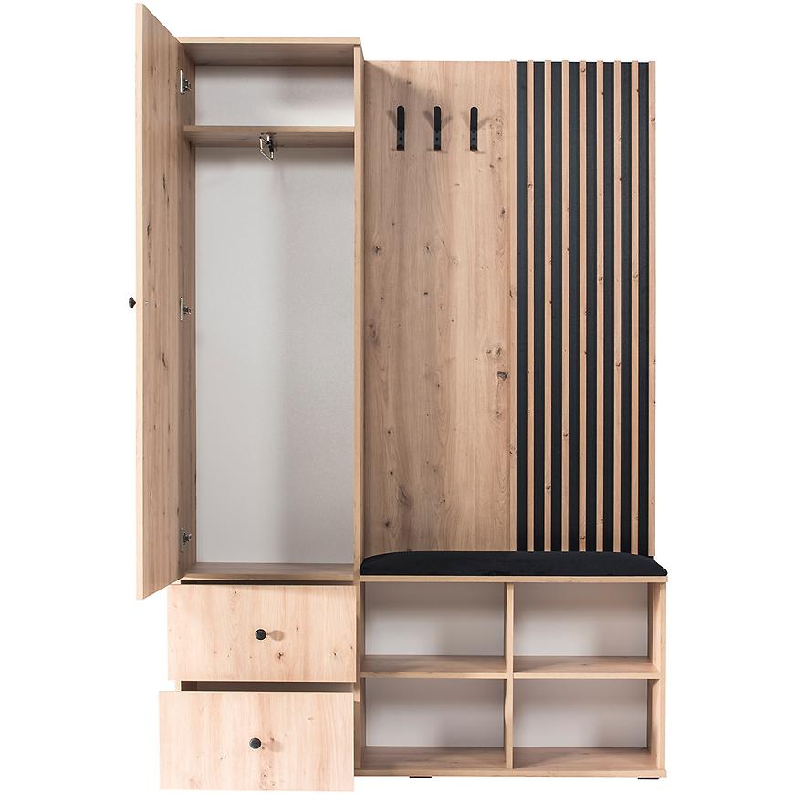 Předsíňová stěna disponuje policemi na boty, dvěma zásuvkami, do kterých uložíte třeba čepice nebo rukavice. Nad nimi naleznete velkou šatní skříň se, kam můžeme dát bundy a kabáty. Ve skříni jsou tři kovová ramínka, která jsou konstruována tak, že na každé z nich můžete pověsit až šest kusů oblečení. Při obouvání bot se posadíte na pohodlný černý podsedák, který ladí se stejnobarevnými lamelami.