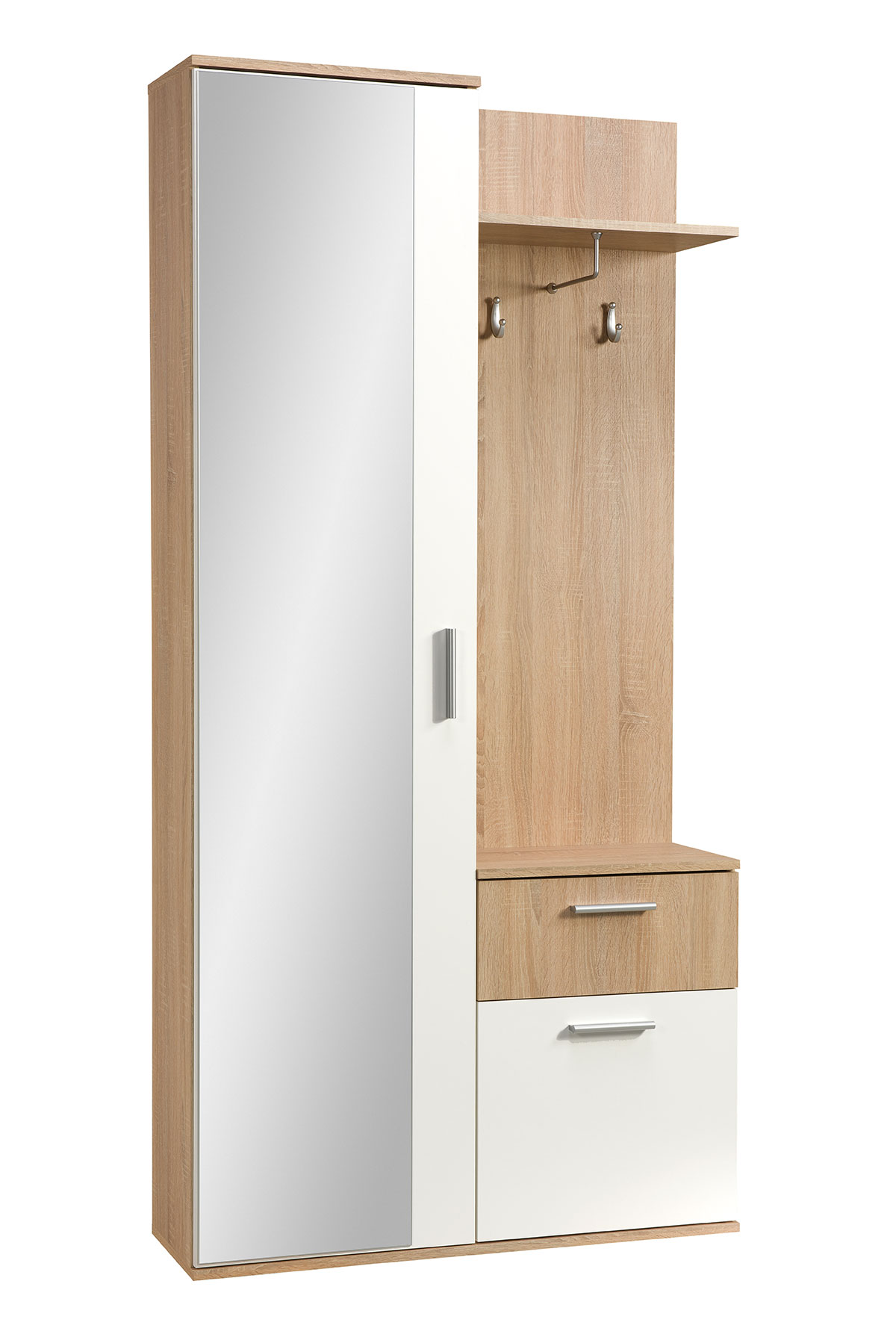 Předsíňová stěna se zrcadlem, zásuvkou, prostorem pro boty, dvěma věšáky a praktickou policí. Největší výhodou je možnost univerzální montáže. Šatní skříň může být vpravo i vlevo.