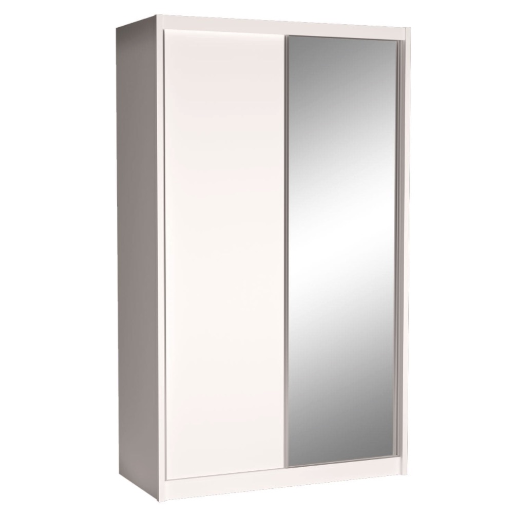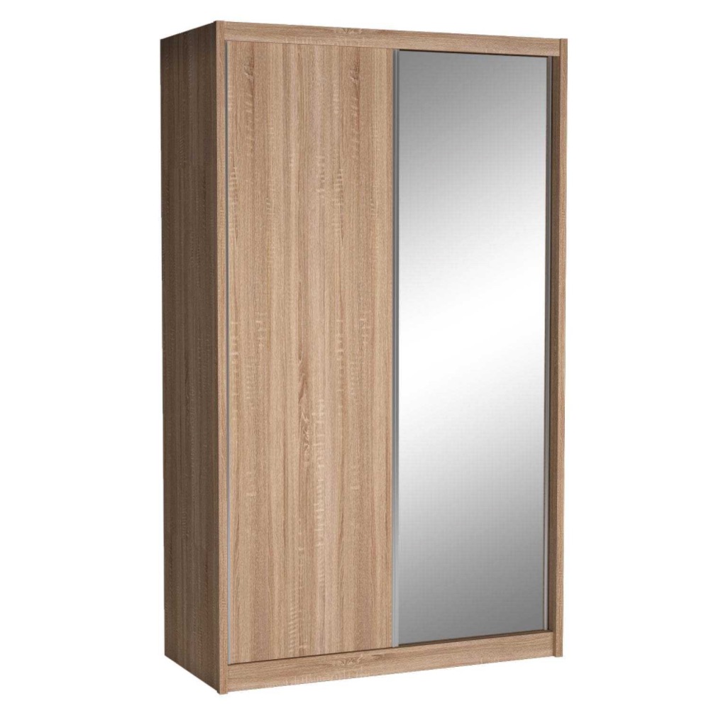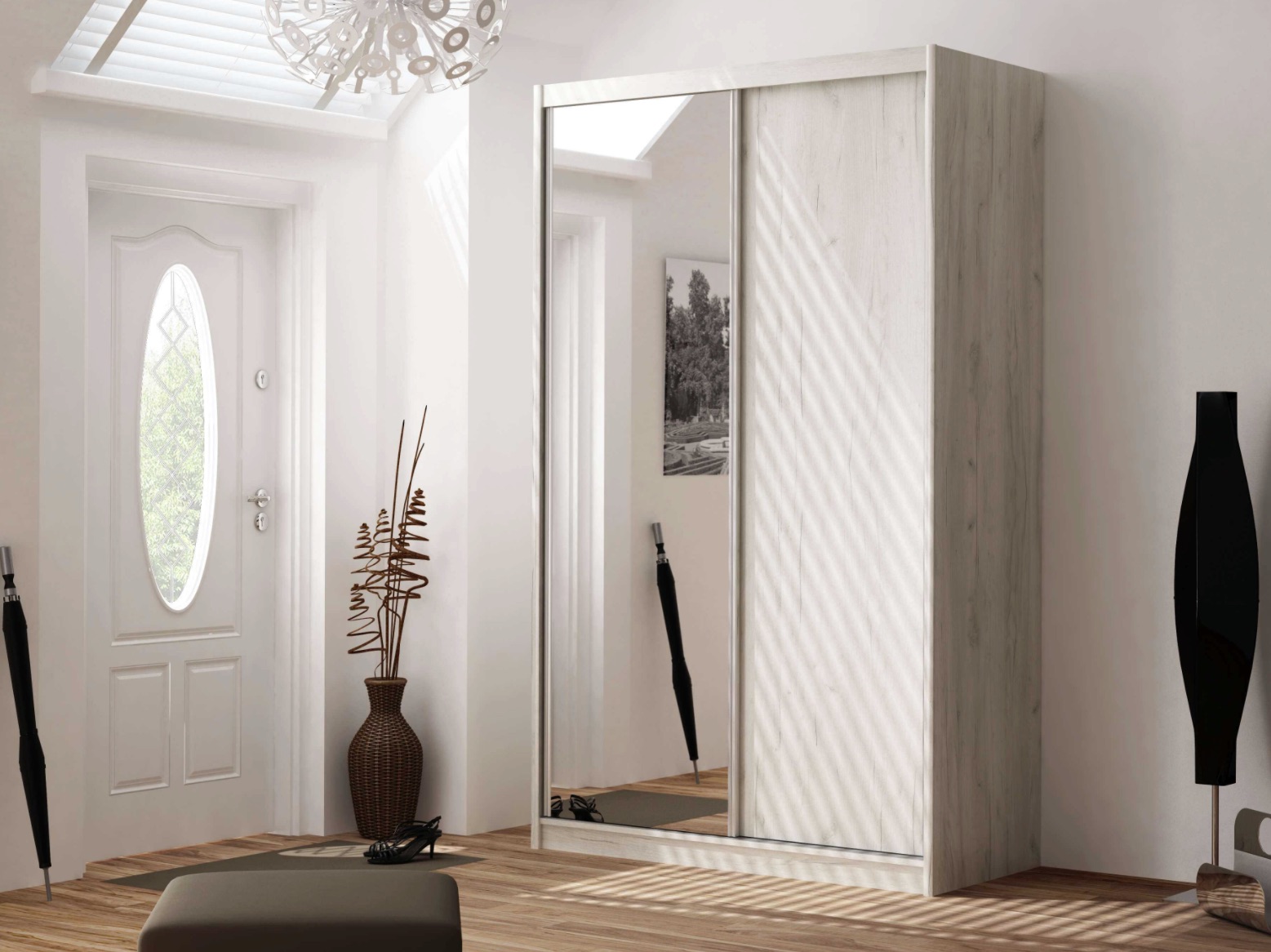 Menší šatní skříň s posuvnými dveřmi a zrcadlem, která má dostatek prostoru a hodí se všude tam, kde není moc místa. Je dostupná v různých barevných provedeních, aby se dala dosadit do každého interiéru. Materiály: Lamino desky s ABS hranami, záda HDF, kovová šatní tyč