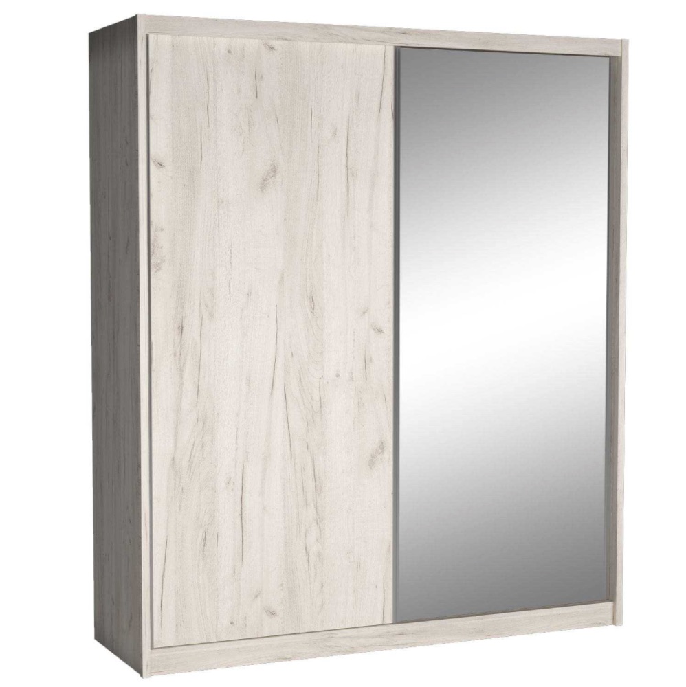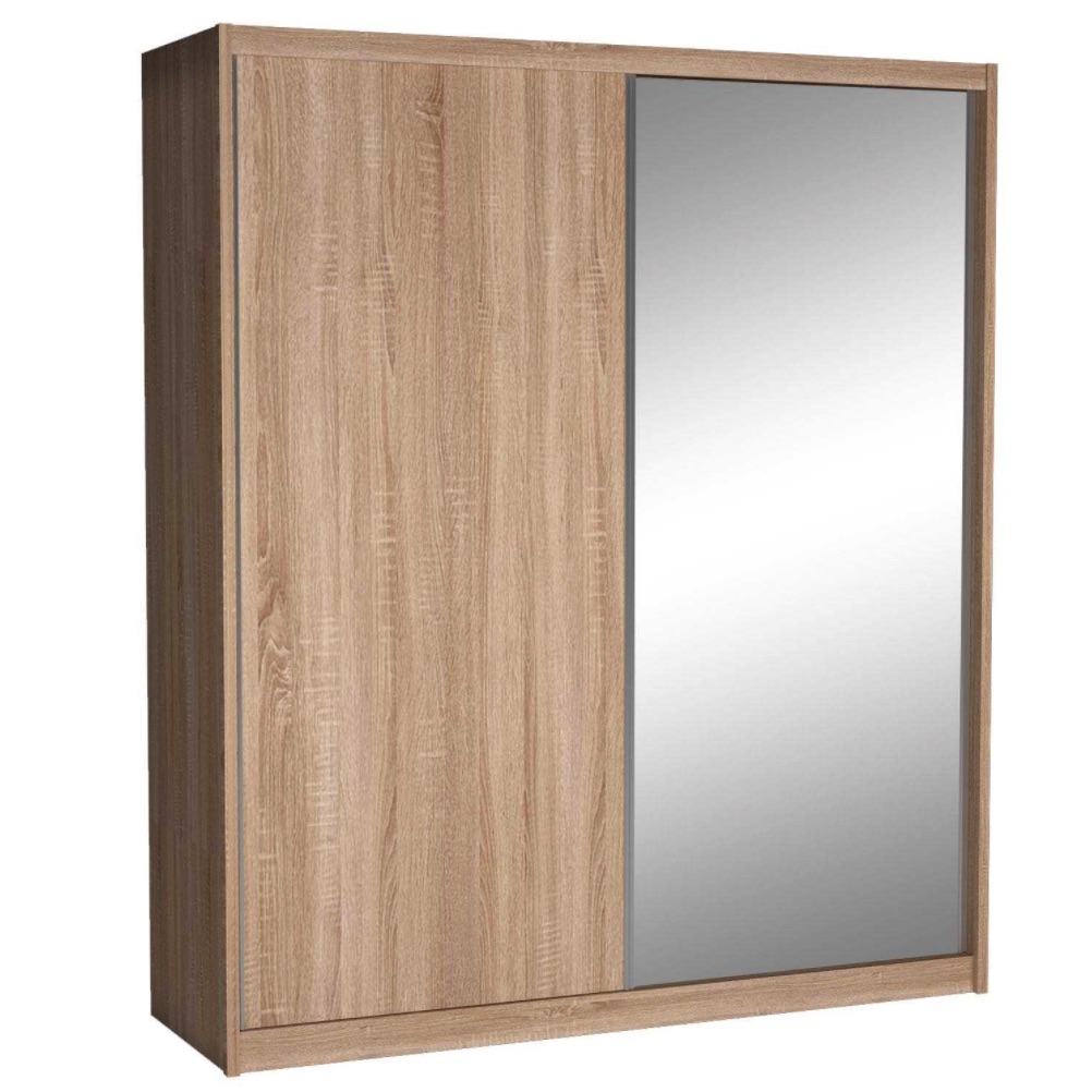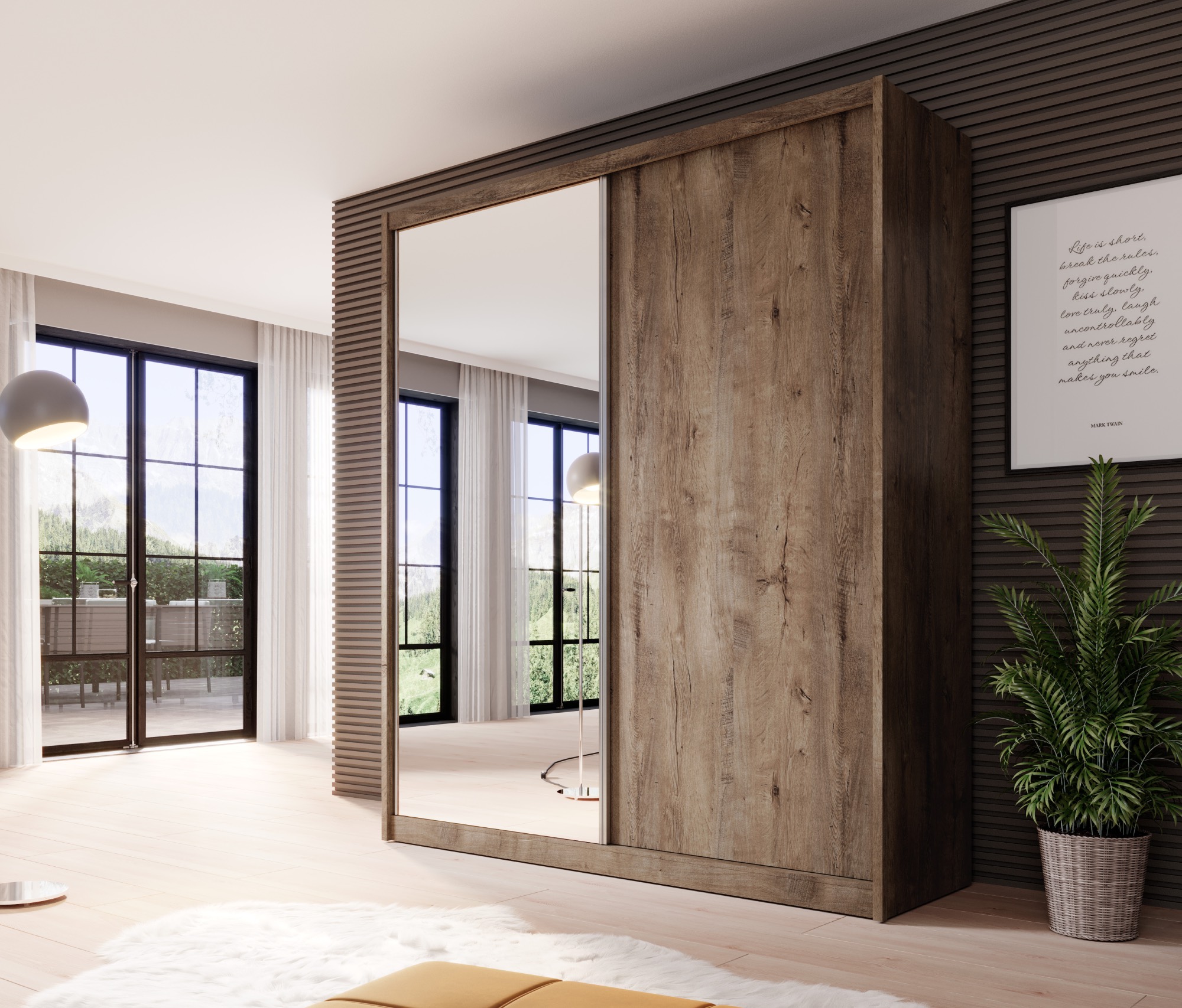 Velká a prostorná šatní skříň s posuvnými dveřmi a zrcadlem. Díky velkému množství polic a zásuvek budete mít konečně dostatek místa pro uložení šatů a módních doplňků. Materiály: Lamino desky s ABS hranami, záda HDF deska v bílé barvě, kovová šatní tyč 97,2 cm