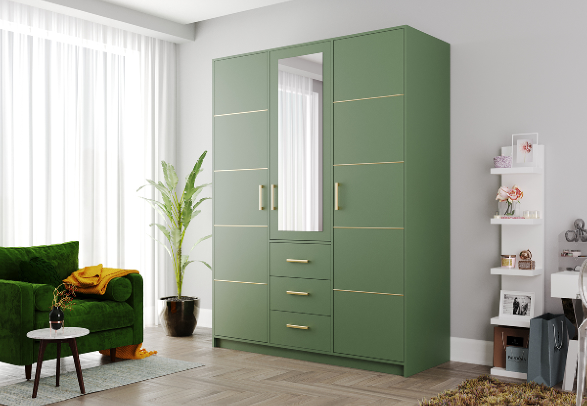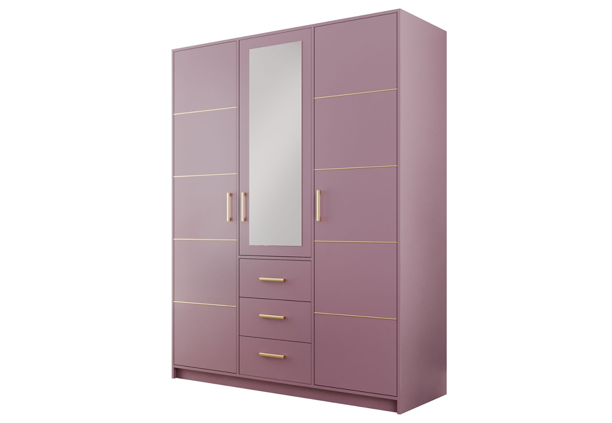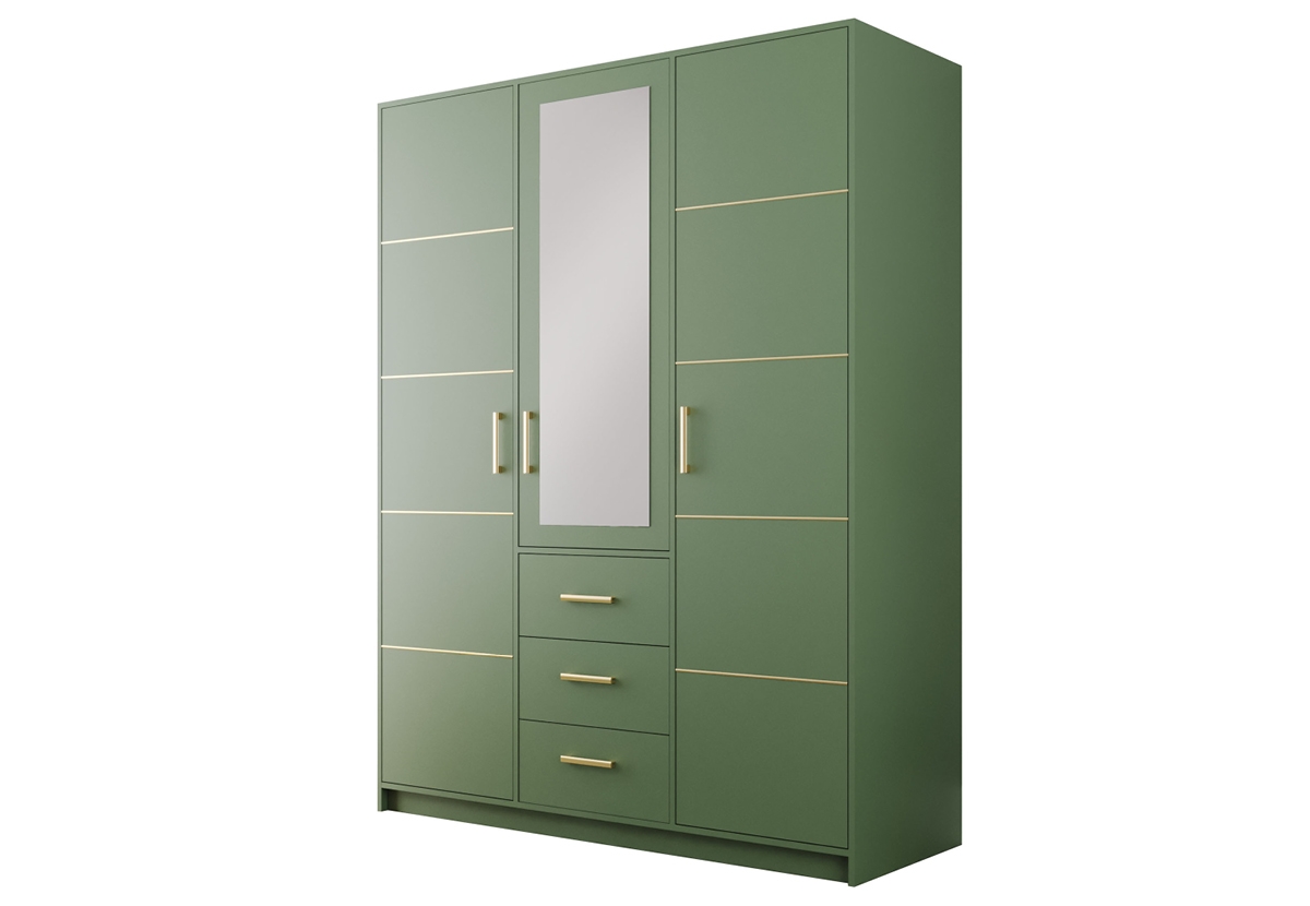 Lamino, zrcadlo, kovové úchytky, šatní tyč, dostatek polic, tři zásuvky a dekorativní lišta ve zlaté barvě.