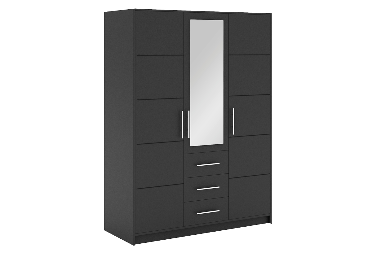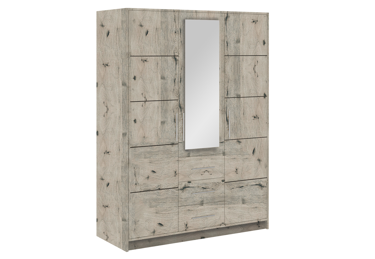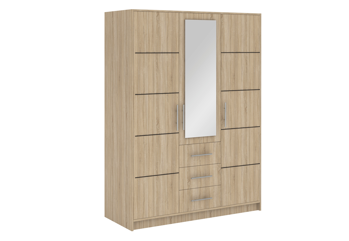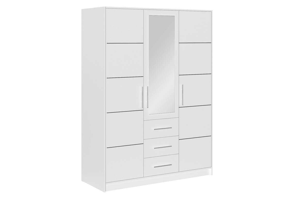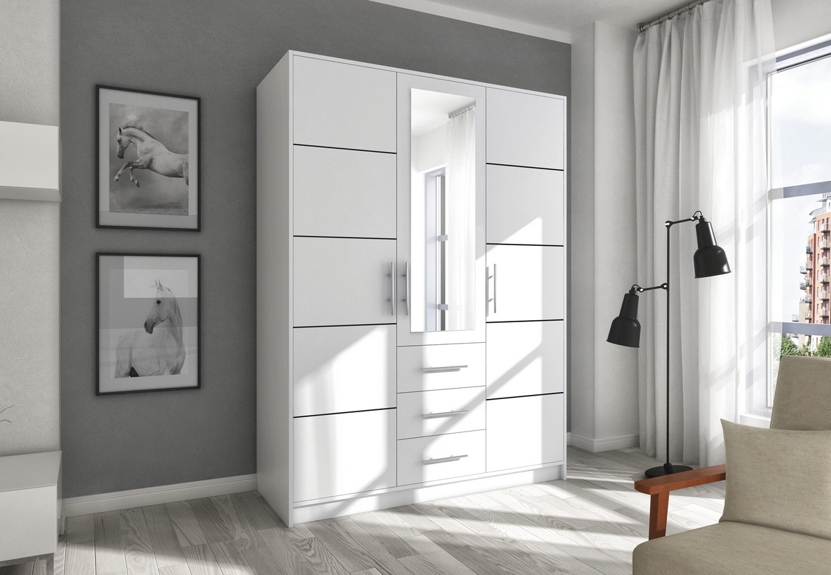 Lamino, zrcadlo, kovové úchytky, šatní tyč, dostatek polic, tři zásuvky a dekorativní lišta.