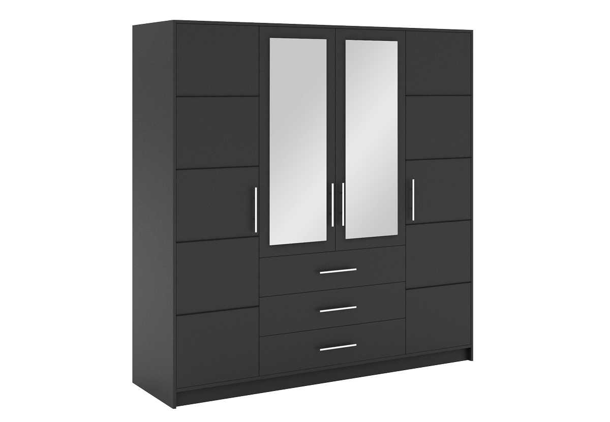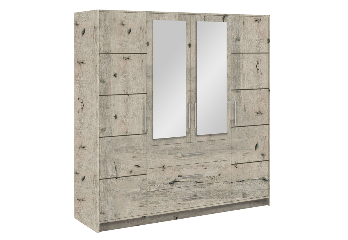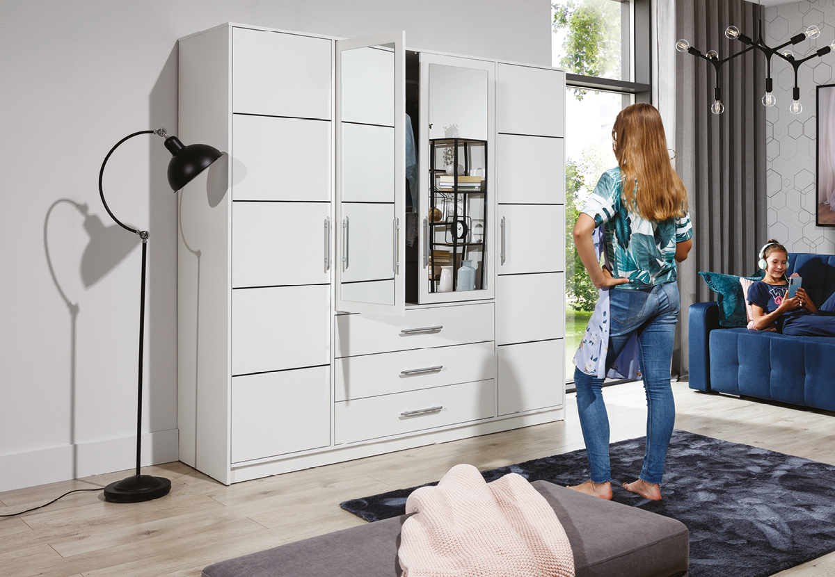 Lamino, zrcadlo, kovové úchytky, šatní tyč, dostatek polic, tři zásuvky a dekorativní lišta.