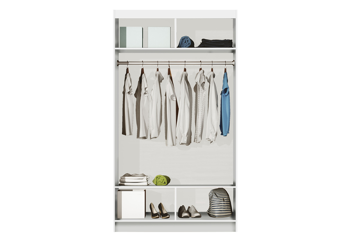 Lamino, hliníkové kolejnice, zrcadlo, šatní tyč, dostatek polic.