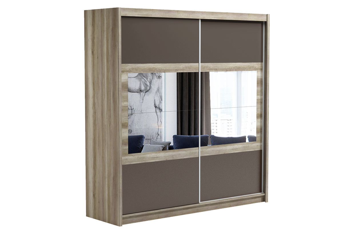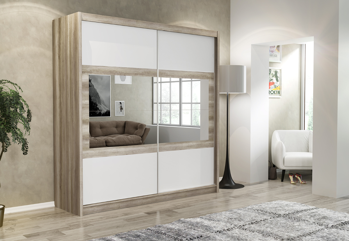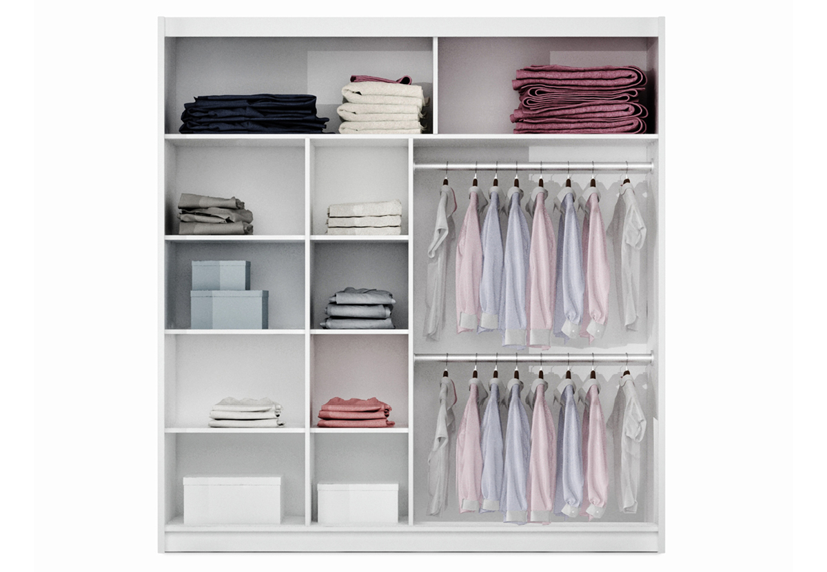 Lamino, zrcadlo, kování HÄFELE, dvě šatní tyče a dostatek polic.