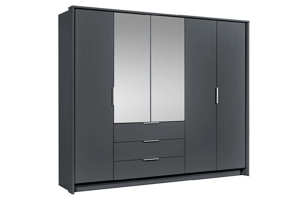 Lamino, zrcadlo, kování Hettich, tři šatní tyče, tři zásuvky a dostatek polic.