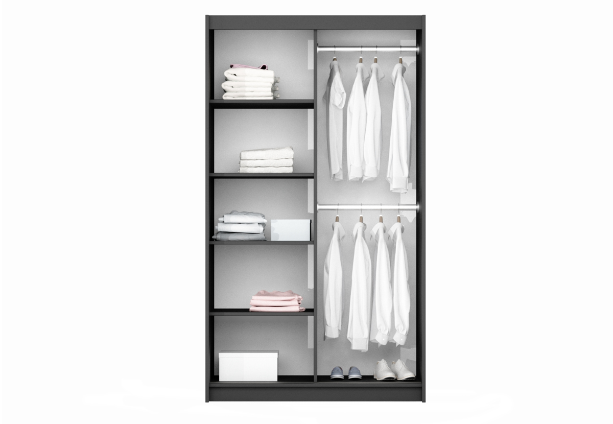 Lamino, kování HÄFELE, zrcadlo, dvě šatní tyče, dostatek polic.