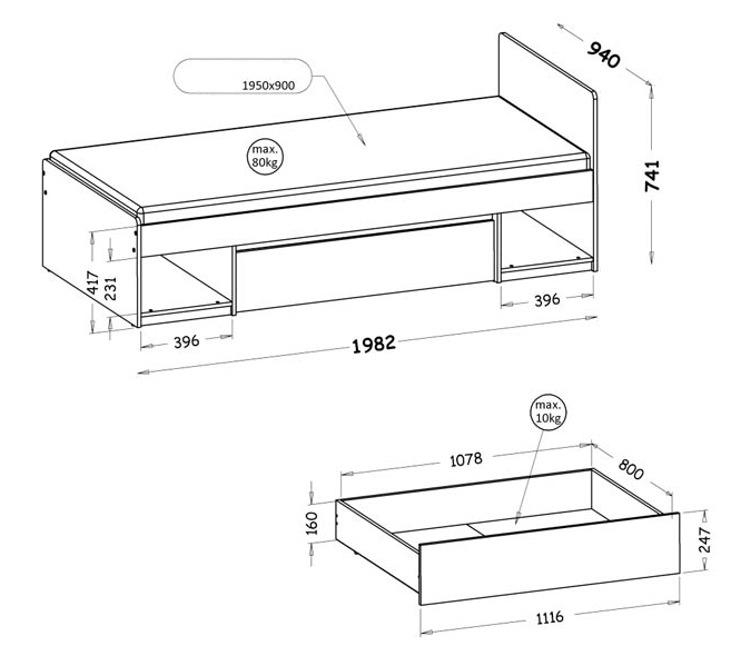 Postel s úložným prostorem, vč. roštu, bez matrace.