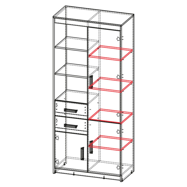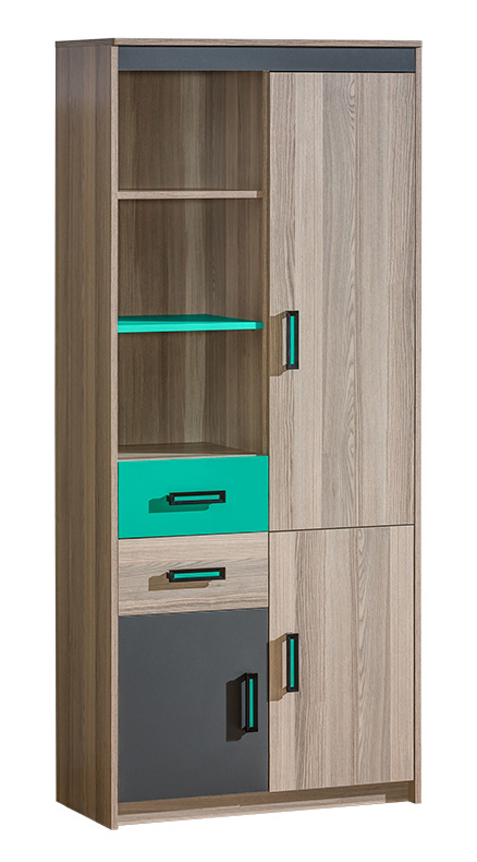 Dětský pokoj v dekoru Jasan Coimbra kombinovaný s grafitově šedou a zářivě zelenou barvou potěší staršího školáka nebo mladšího studenta. Pozornost přitahují výrazné úchytky. Materiály: LDT, ABS