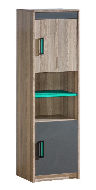 Dětský pokoj v dekoru Jasan Coimbra kombinovaný s grafitově šedou a zářivě zelenou barvou potěší staršího školáka nebo mladšího studenta. Pozornost přitahují výrazné úchytky. Materiály: LDT, ABS