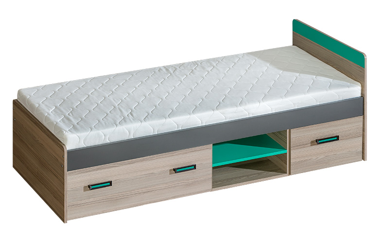 Dětský pokoj v dekoru Jasan Coimbra kombinovaný s grafitově šedou a zářivě zelenou barvou potěší staršího školáka nebo mladšího studenta. Pozornost přitahují výrazné úchytky. Materiály: LDT, ABS