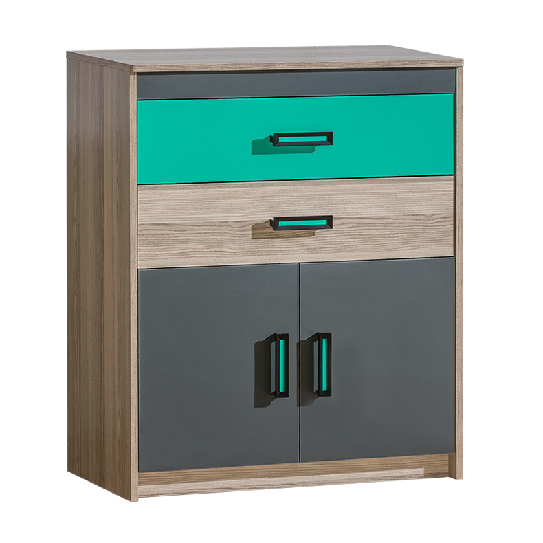 Dětský pokoj v dekoru Jasan Coimbra kombinovaný s grafitově šedou a zářivě zelenou barvou potěší staršího školáka nebo mladšího studenta. Pozornost přitahují výrazné úchytky. Materiály: LDT, ABS