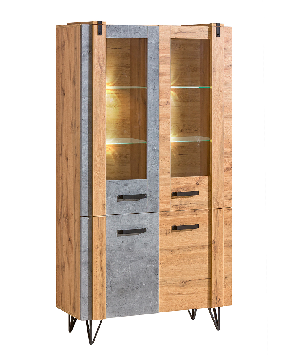 Moderní nábytek na nožkách dodá interiéru tolik potřebnou vzdušnost. Barevná kombinace dekorů Dub Wotan a beton působí stylovým dojmem. Materiály: LTD, ABS