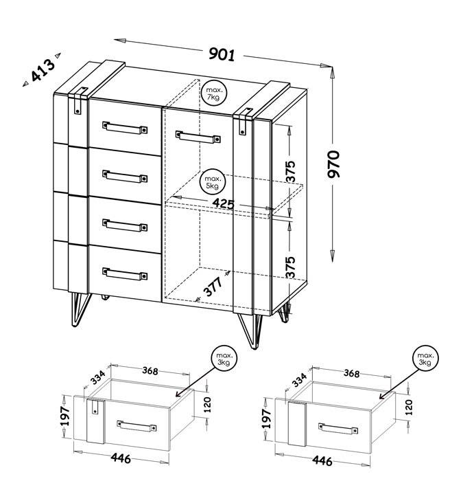 Moderní nábytek na nožkách dodá interiéru tolik potřebnou vzdušnost. Barevná kombinace dekorů Dub Wotan a beton působí stylovým dojmem. Materiály: LTD, ABS