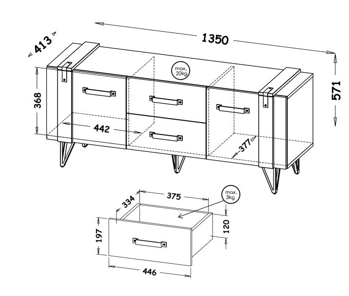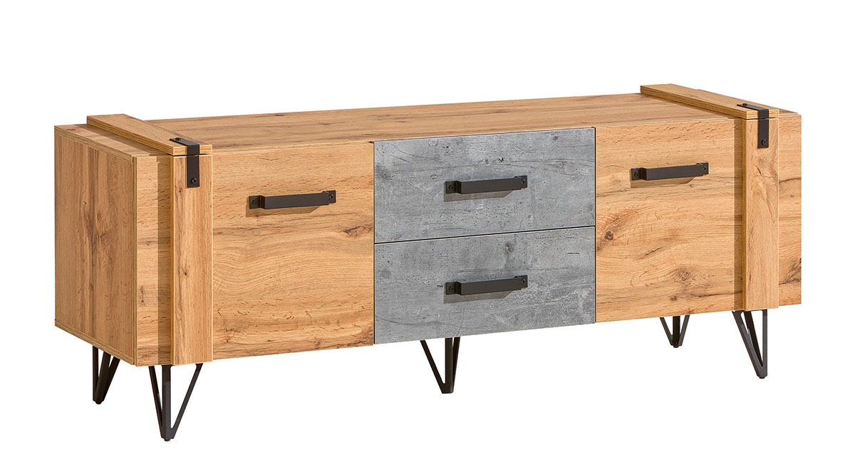 Moderní nábytek na nožkách dodá interiéru tolik potřebnou vzdušnost. Barevná kombinace dekorů Dub Wotan a beton působí stylovým dojmem. Materiály: LTD, ABS