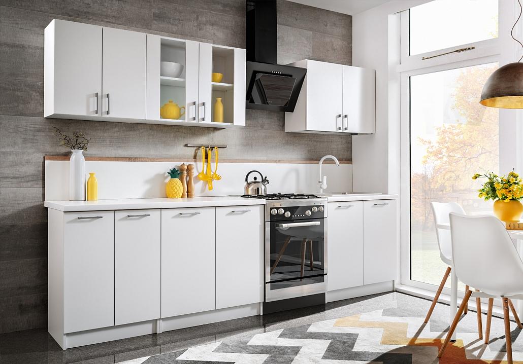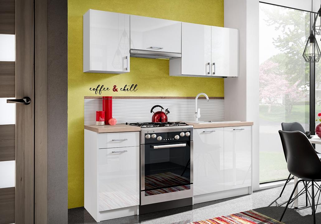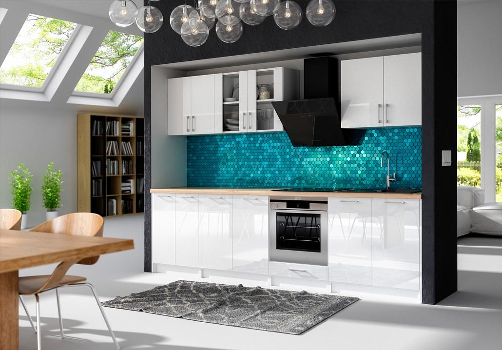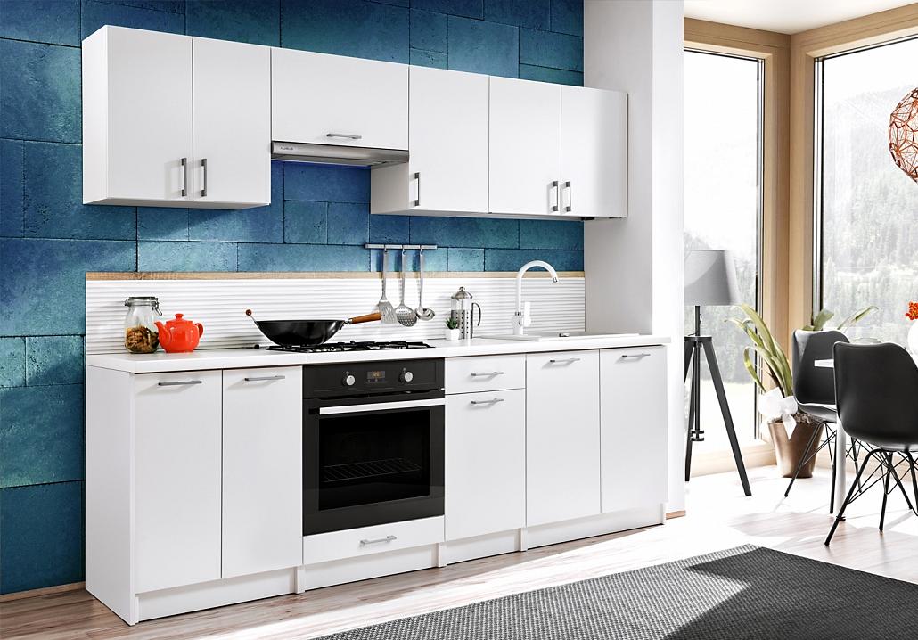 Korpusy jsou vyrobeny z kvalitní LTD desky 16 mm v bílé barvě. Kování s tlumeným dovíráním dvířek. Skříňky se zásuvkami mají kolečkové výsuvy a tlumič dovírání lze doobjednat. Úchytky (rozteč 96 mm) a kování jsou v ceně. Skříňky nestojí na nožkách. Záda jsou ze sololitu a ve skříňkách (kromě dřezových) jsou police s nosností 14–24 Kg. Dvířka 18 mm (PVC hrany) mají naznačeny otvory pro úchytky, ale nejsou provrtány skrz, takže můžete použít jakékoliv jiné úchytky.