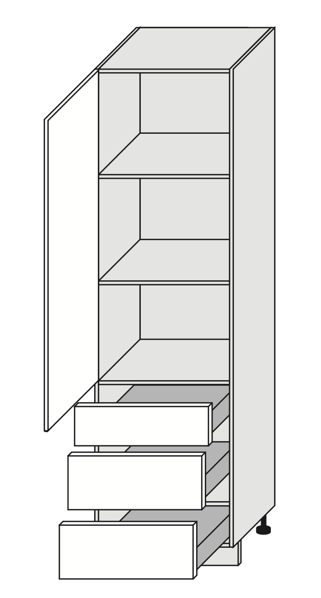 Možnost regulace výšky v případě nerovných podlah. Výška kuchyně s pracovní deskou 3,8 cm je 86 cm (nožky 10 cm) nebo 91 cm (nožky 15 cm). Sokly 10 cm na zakrytí nožek jsou součástí balení. Pokud vyberete nožky 15 cm, budeme vás kontaktovat kvůli výrobě soklů na míru.