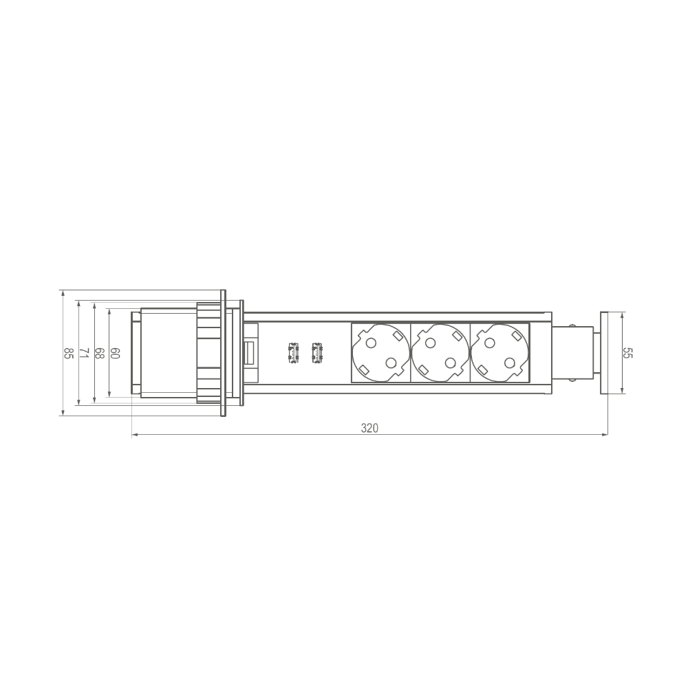 3x zásuvka, 2x USB 2,4 A,kabel 1,5 m, max 3600 W, rozměry v galerii