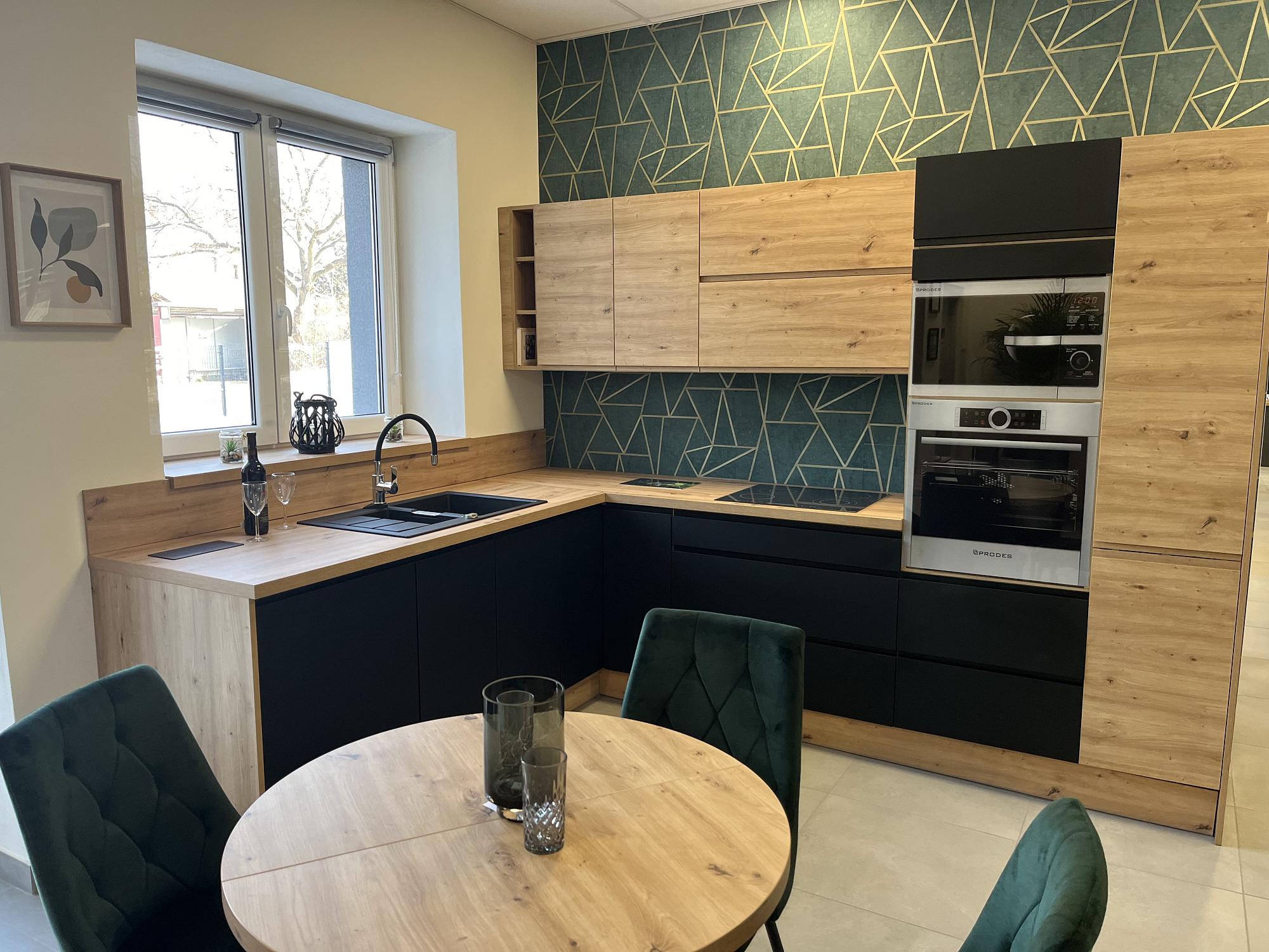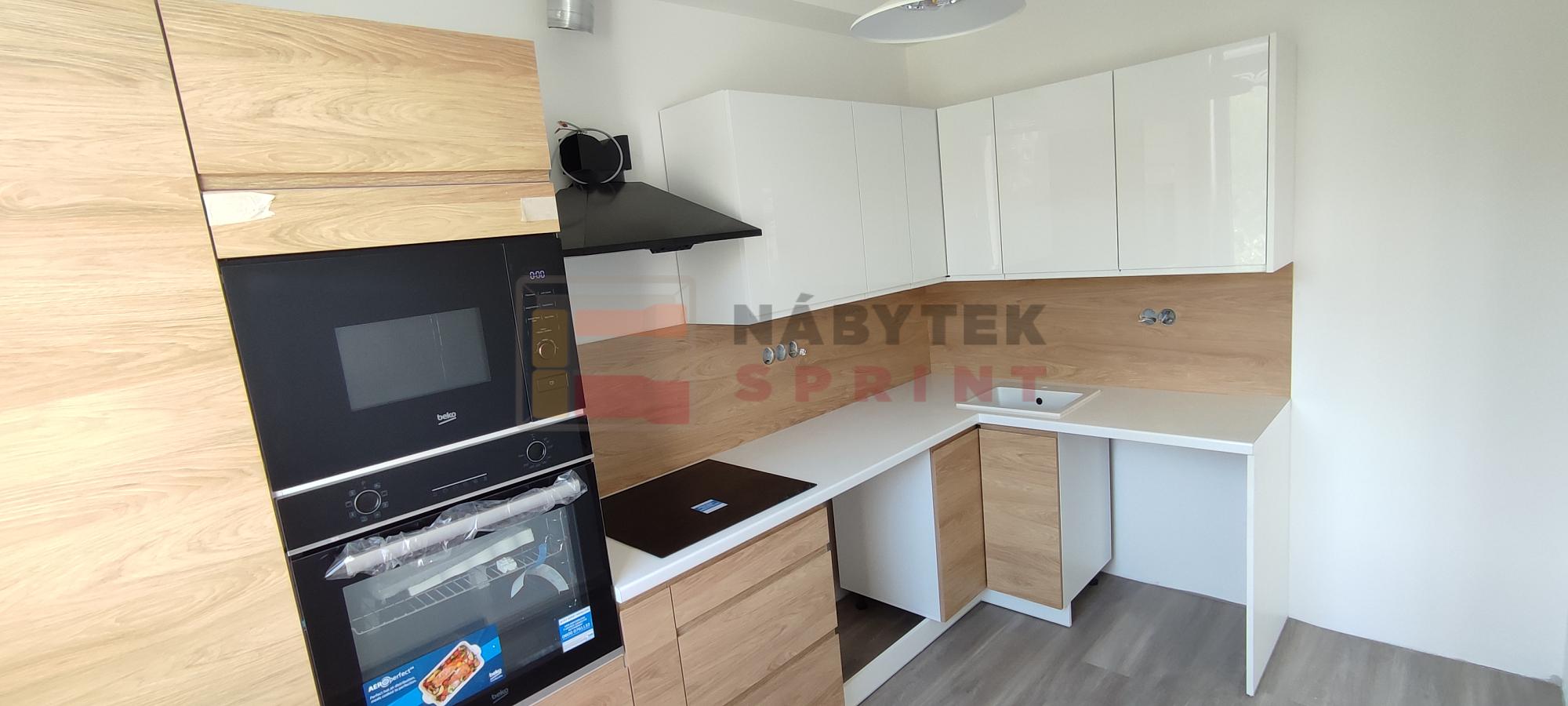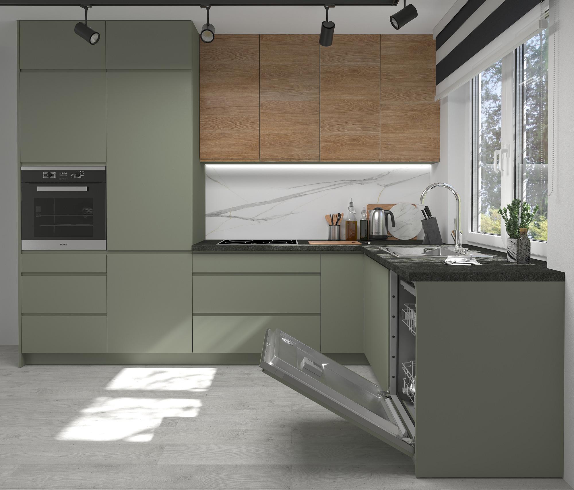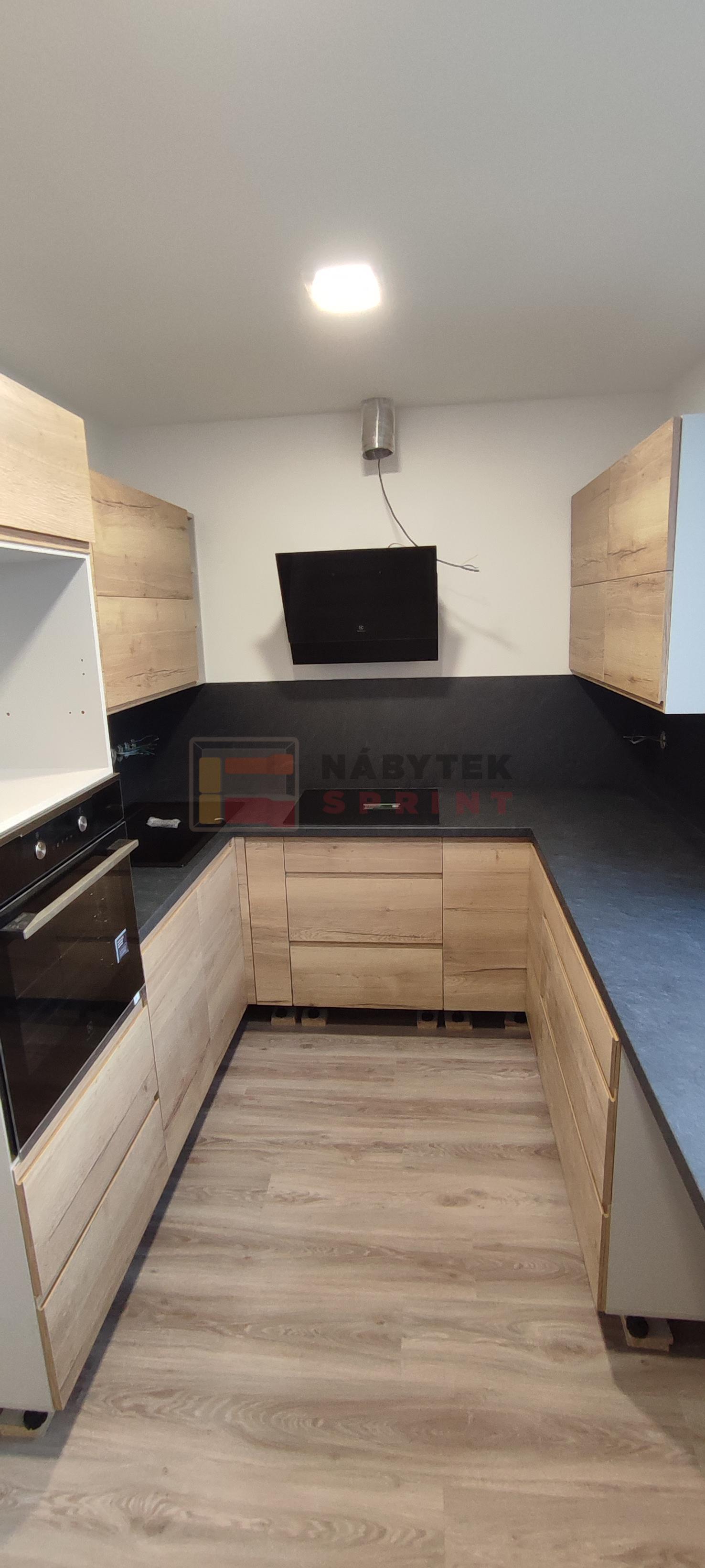 Moderní kuchyňské linky s bezúchytkovými dvířky. Vybírejte z oblíbených dekorů dřeva, které můžete kombinovat s akrylovými dvířky v leském nebo matném provedení.